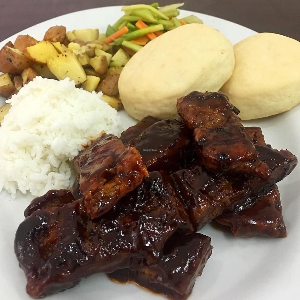 Vegan Homemade BBQ Ribs w/ homemade biscuits, roasted potatoes, rice …