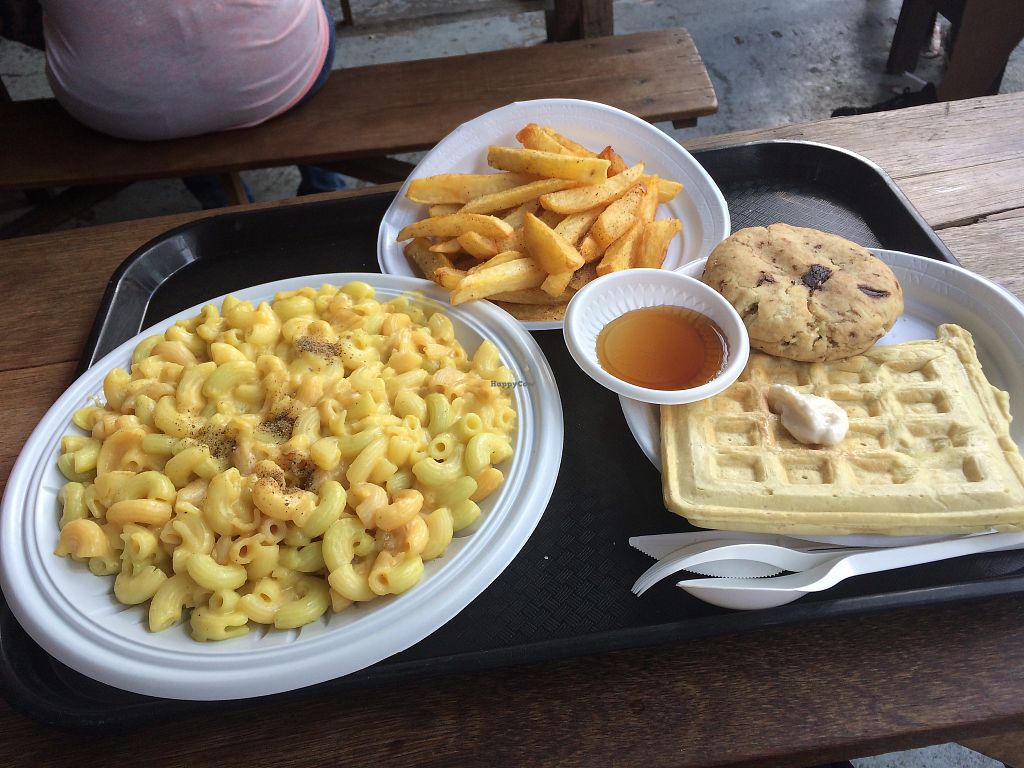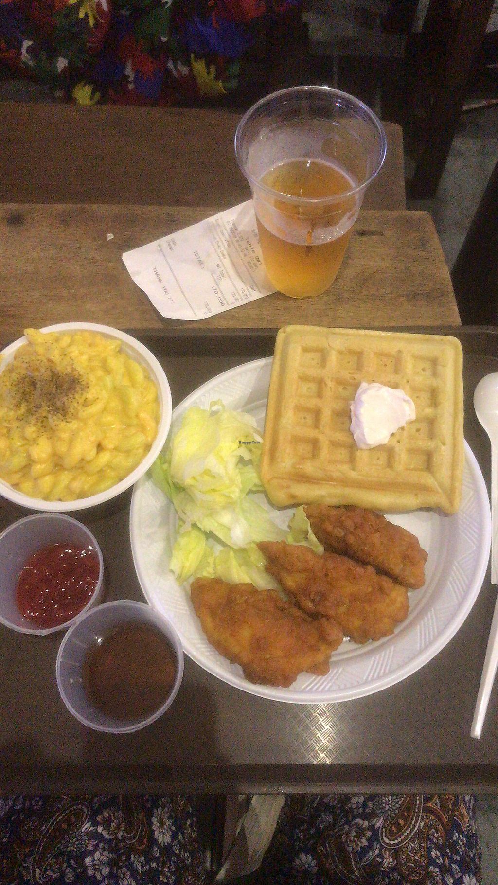 Fried ‘chicken’ and waffle with a side of mac n cheese