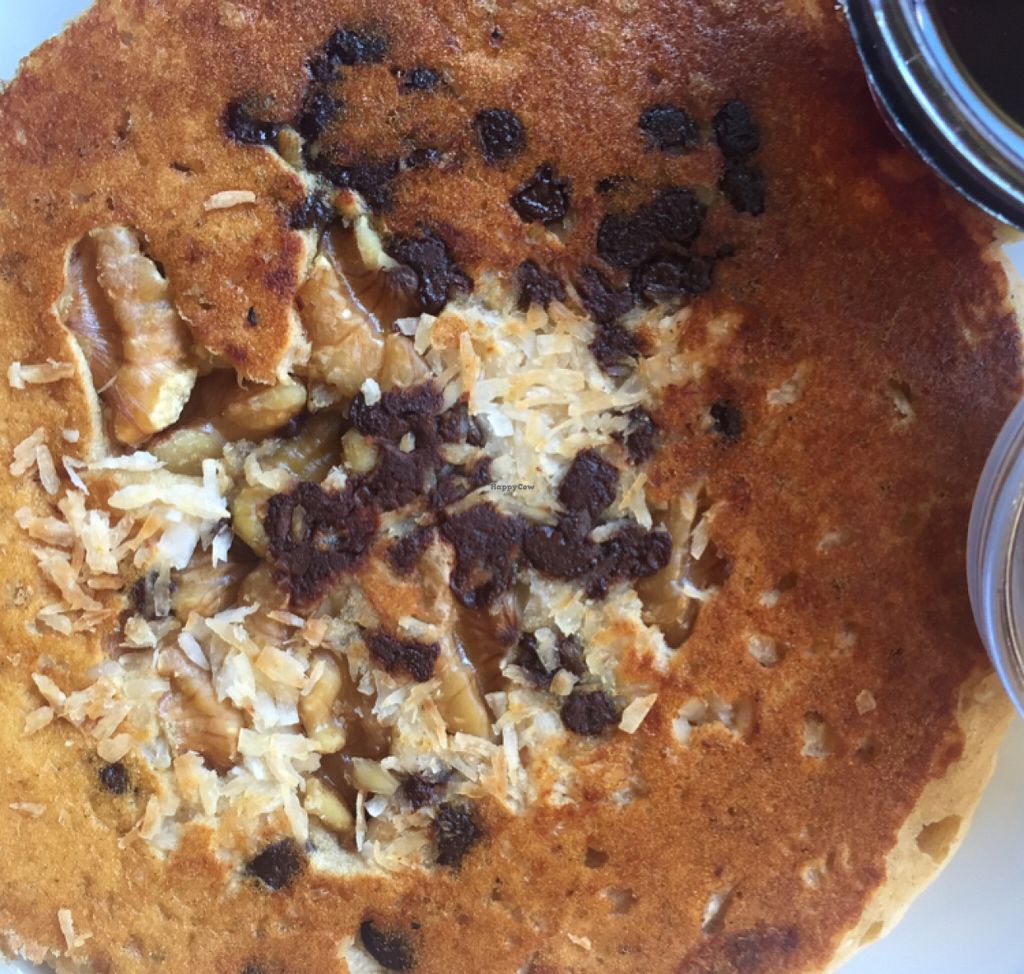 side of trail mix pancake: coconut, chocolate chips, walnuts