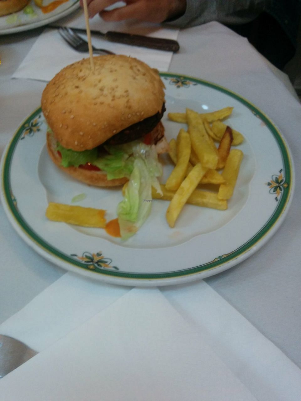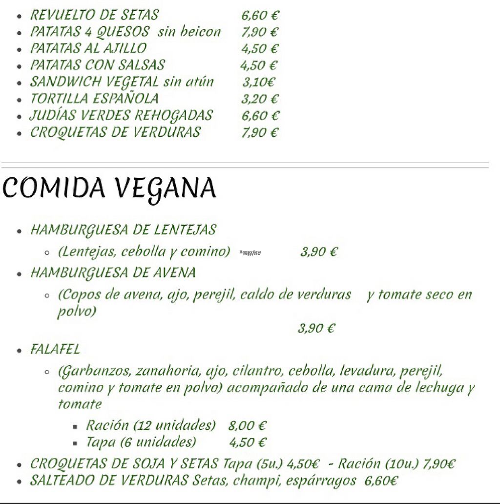 Serves meat, vegan options available. Traditional bar that has a special marked menu for vegans with two types of burgers plus falafel, and croqueta. Has soy milk. Reported closed, April '23.