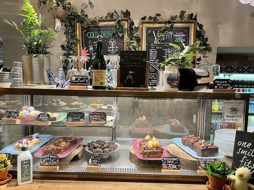 A variety of salads and currys all vegan and about half gluten free too. Has indoor and outdoor seating.
