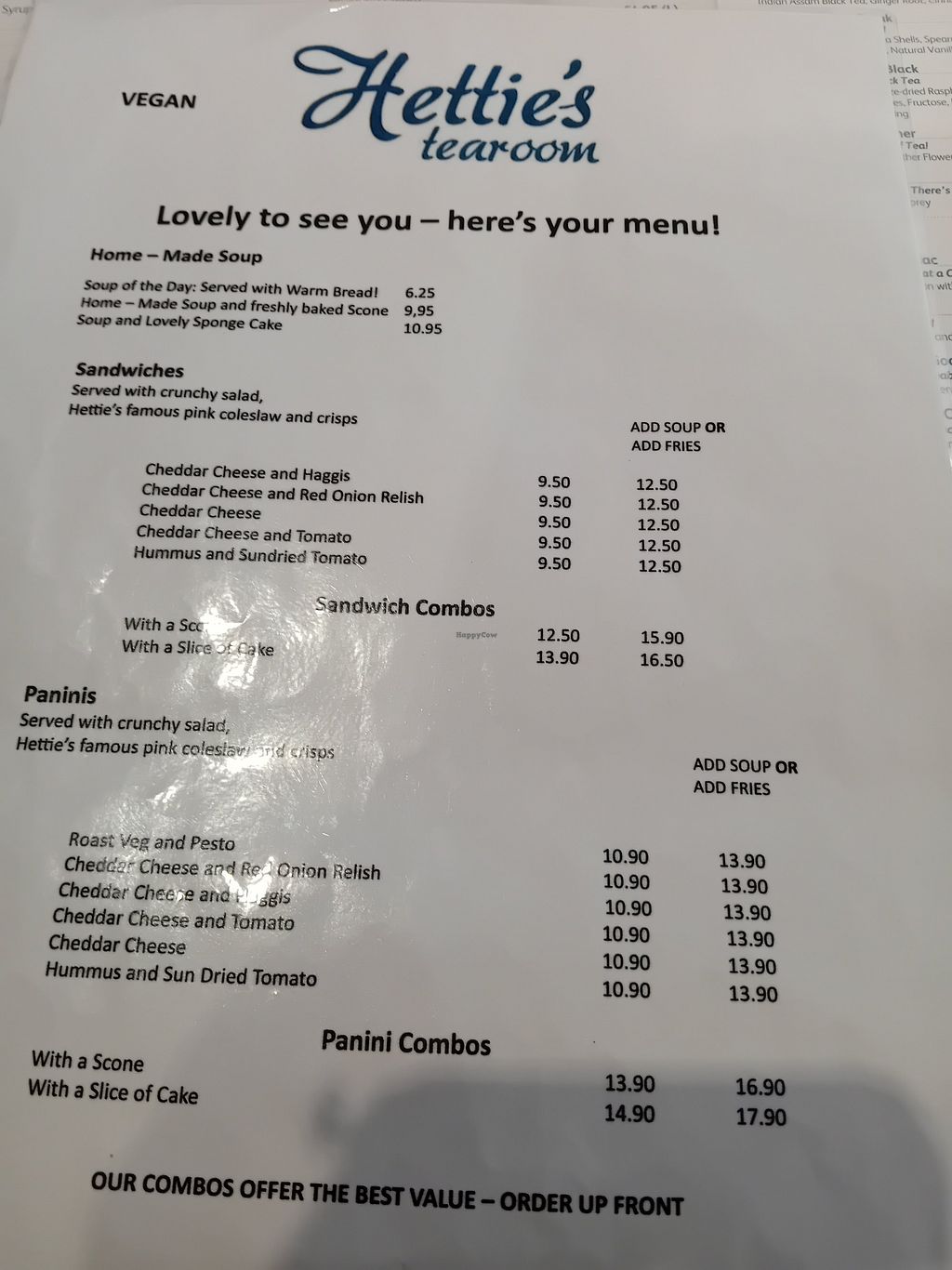 They have a separate vegan menu that you need to request. On the day they had 5 vegan cakes & a vegan biscuit. They have oat, soya and coconut milk for teas & milkshakes. We were offered non bone china cups by the boss when she saw we were ordering vegan. They have a wide range of loose leaf teas that vary in price and were good quality. We made the most of some combo deals: panini & chips a sandwich and cake deal. We chose a carrot cake, a haggis & cheese sandwich and a roasted veg and pesto panini. It all tasted great and the cheese they use wasn’t too strong/cheesy which works well for me. It came with their special house slaw which was good. The price can add up, especially with the teas but the food and service felt worth it. We also managed to get there just before the crowds which was good as they turned some people away.