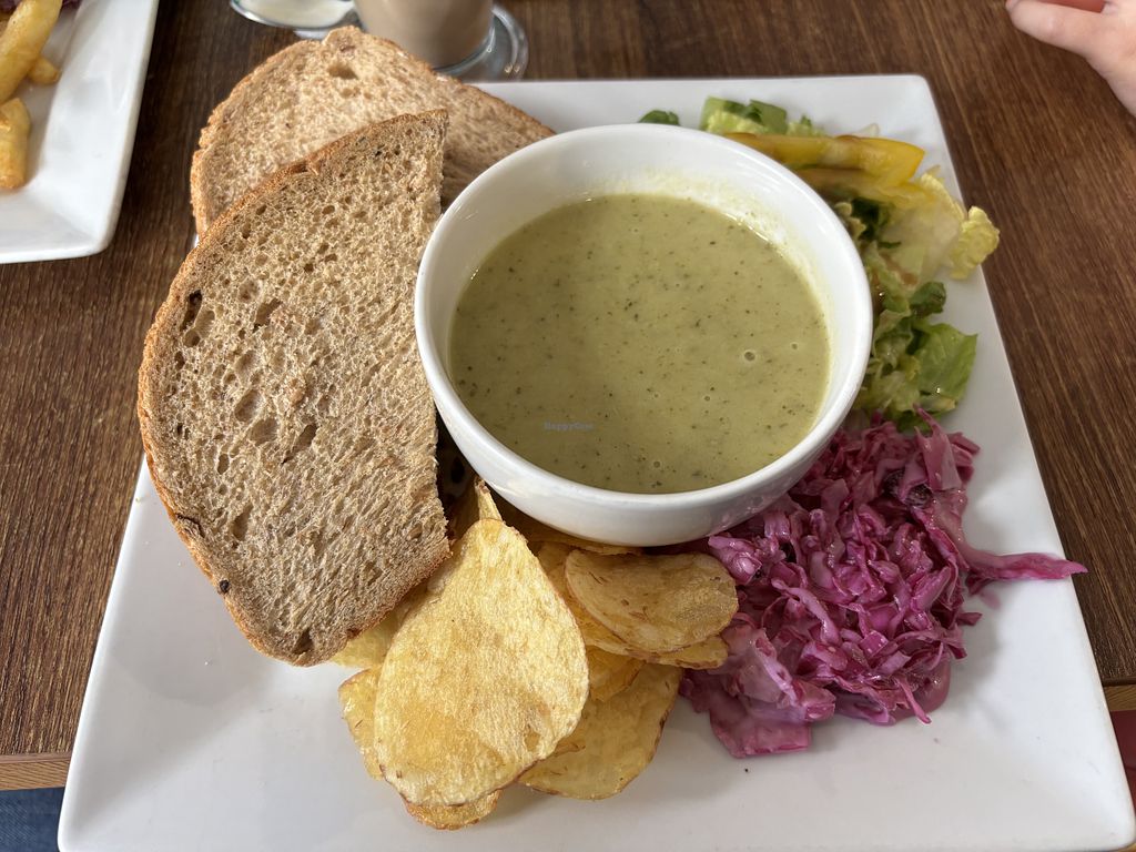 Popped in on the off chance and was pleasantly surprised by the vegan menu then very pleased with portion sizes! Simple, tasty and filling. The haggis and cheeze sandwich came with a tasty vegan coleslaw. My pal had the same with broccoli soup and chips. The cake was decent too.