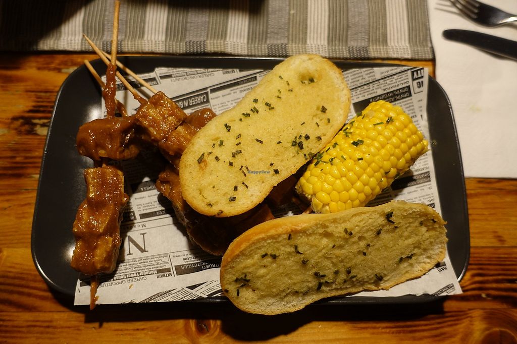Serves meat, vegan options available. Restaurant serving clearly marked vegan dishes. Vegan offer includes house-baked bread with onion spread, salad, garlic bread, Asian/Mexican tofu skewers, four kinds of burgers with bean or vegetable patty, and more. Open Mon-Sun 11:00-21:00.