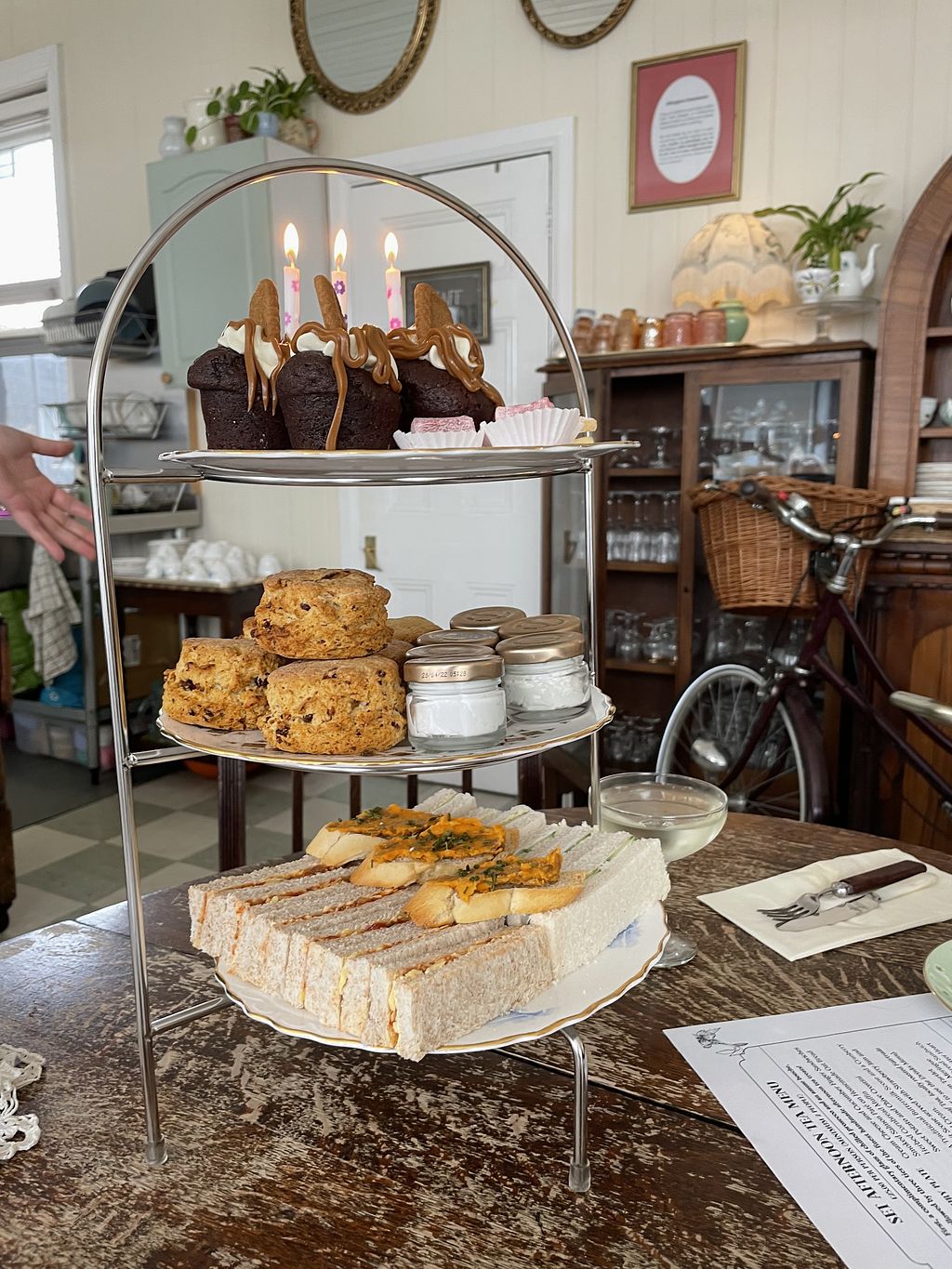 Read moreSavoury- sandwiches were herby cream cheese and cucumber and smoked vegan cheese and pickle, stuffed vine leaf and a not sausage roll.