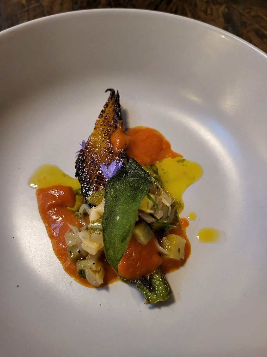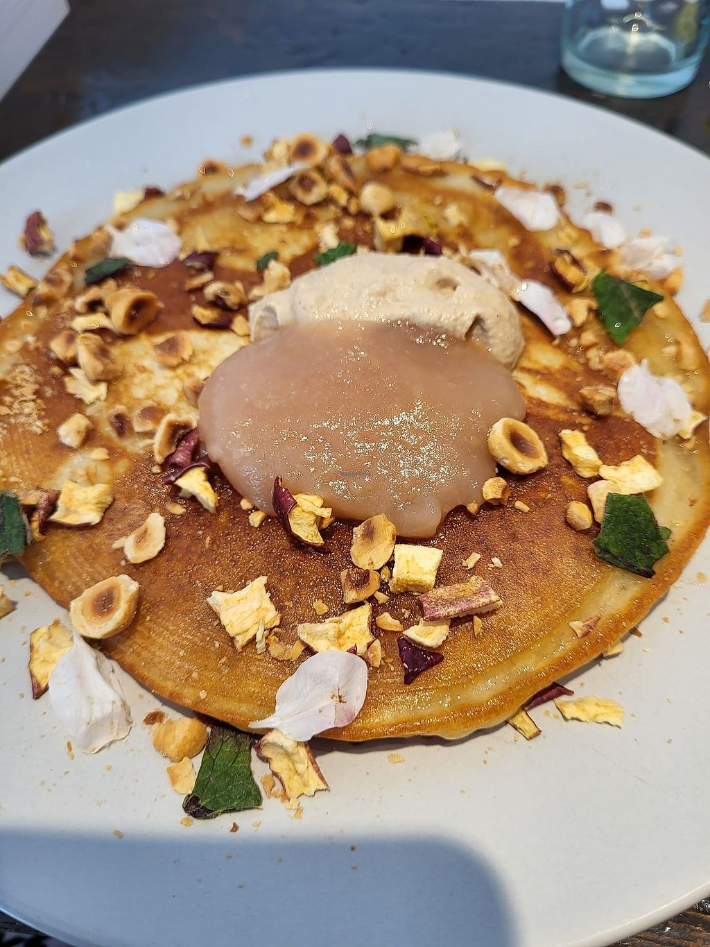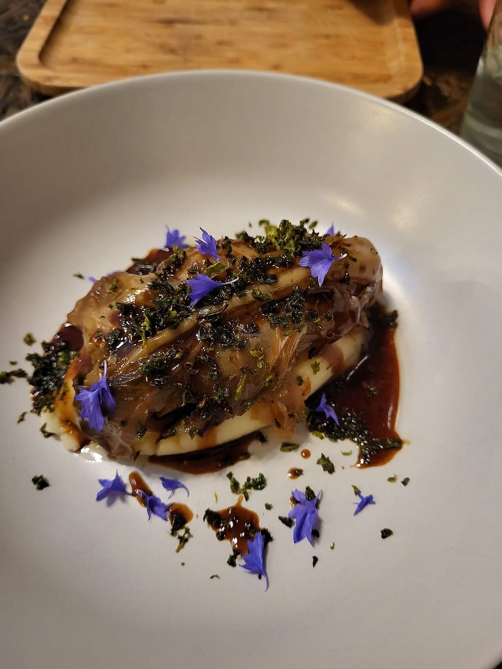 Kale salad, wild garlic dressing, fried tempeh, pickled wild garlic bu…