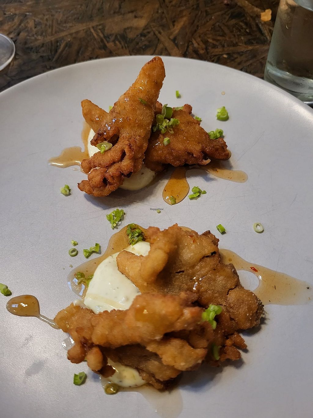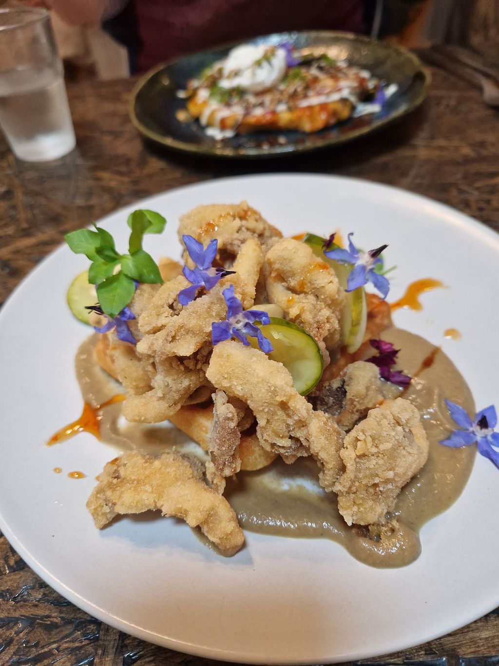"Mushroom Crispy fried oyster mushroom, waffle, mushroom gravy, spicy …