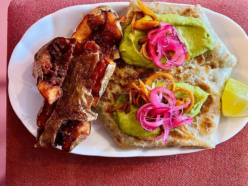 Serves meat, vegan options available. Mexican restaurant offering a few vegan items such as mung bean tacos, mushroom masa tempura, fried tortillas with salsa & stewed black beans and crunch wrap. Open Thu 18:00-23:00, Fri-Sat 10:00-23:30, Sun 10:00-15:00.