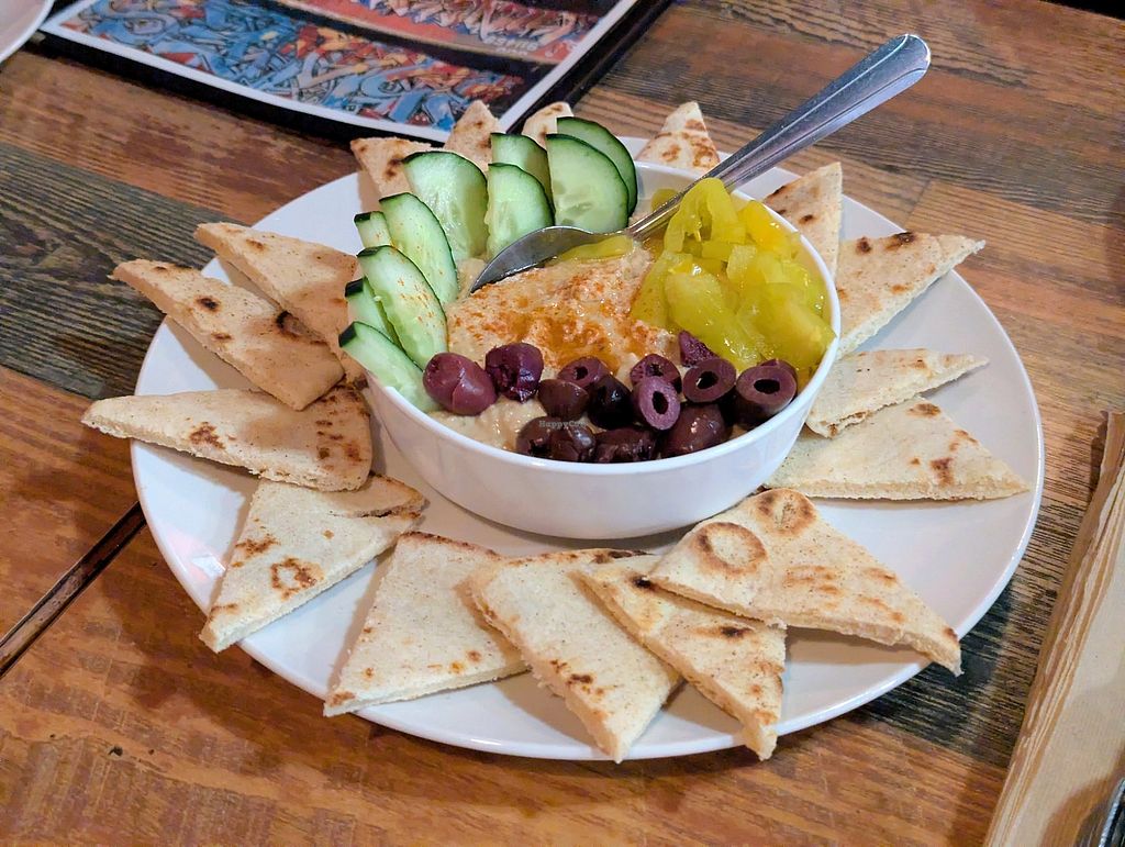 The cucumber pistachio juice was an unexpected delightful and refreshing combination! We had the gyro, chips and hummus, along with a Caesar salad. All were delicious with the gyro rising to exceptional, better than the original meat version.