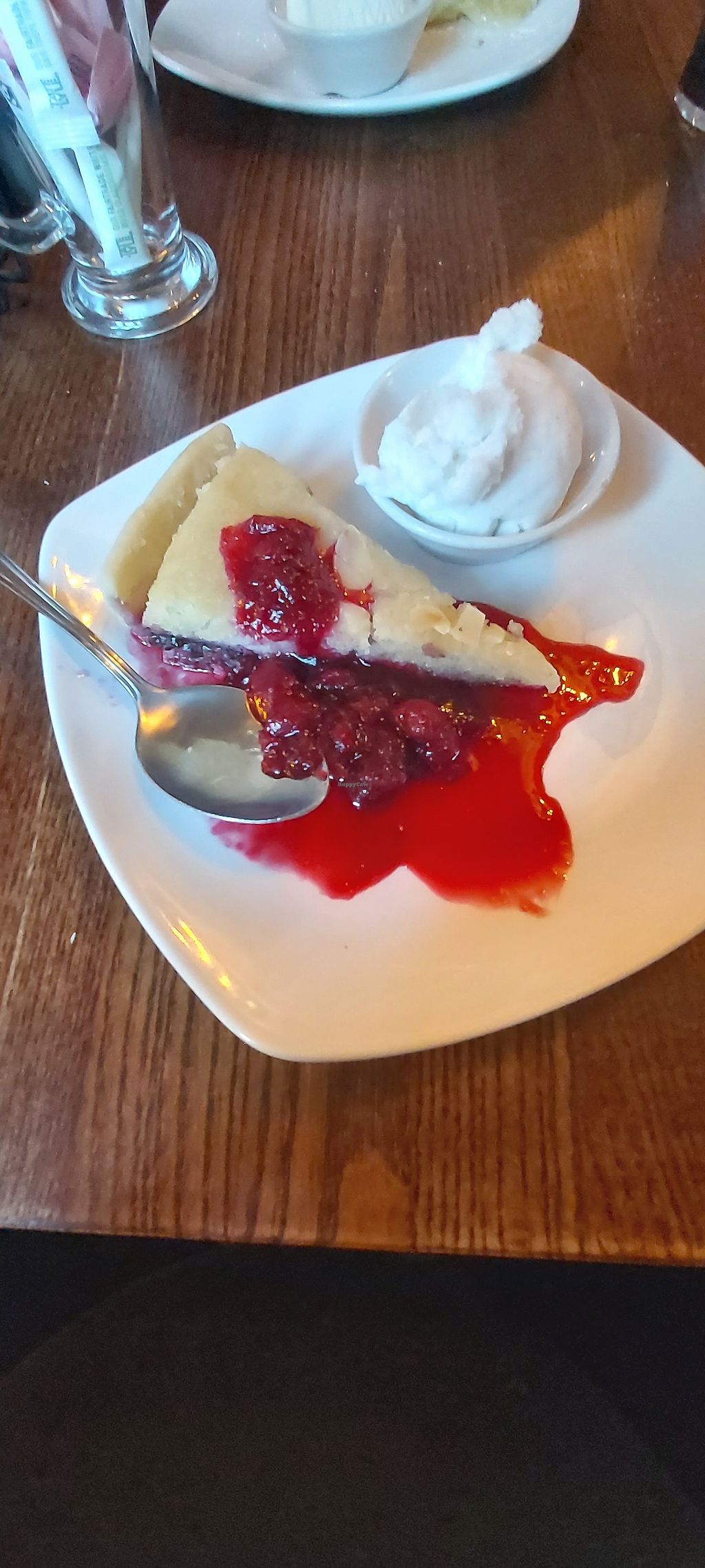 Vegan bakewell tart with ice cream -- delicious!