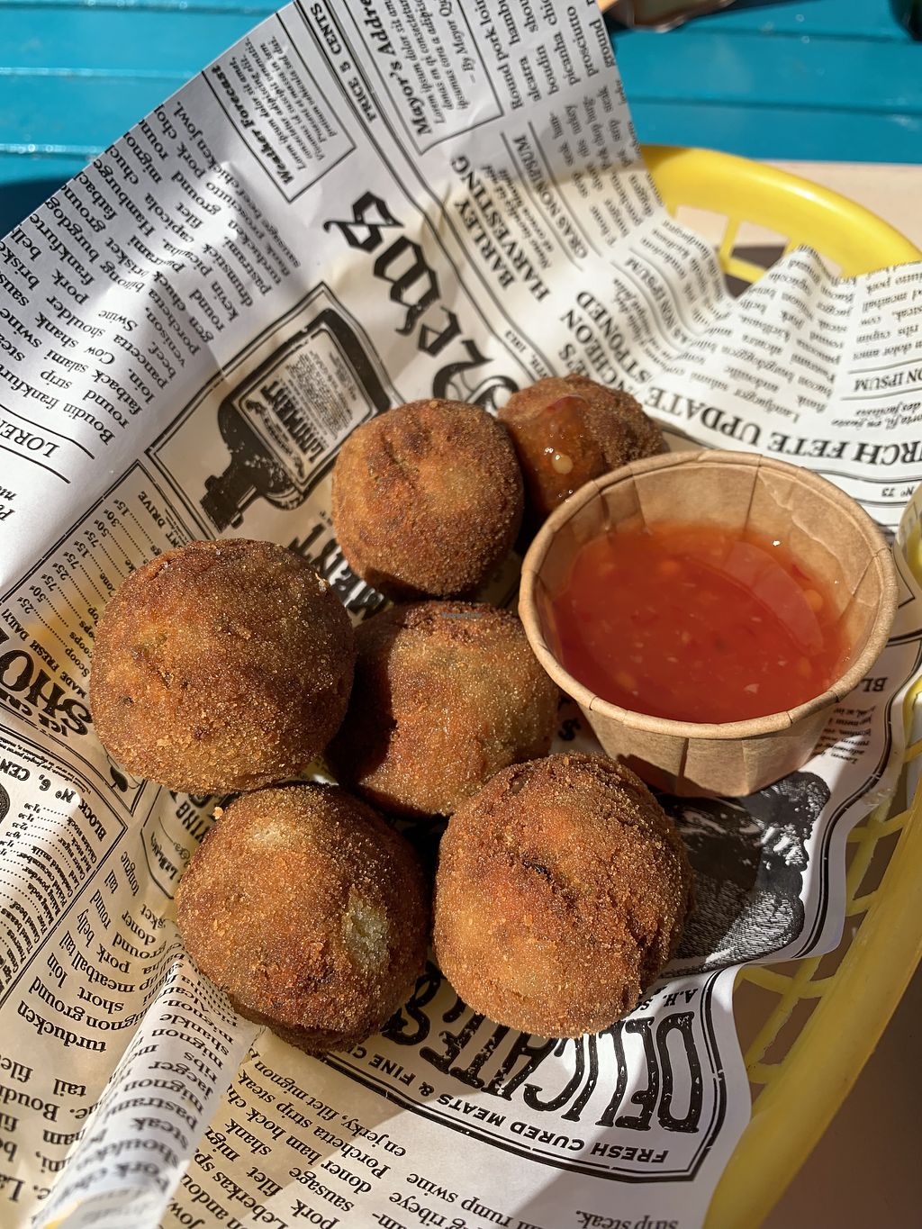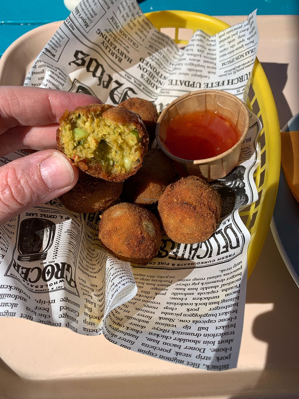 Nicht nur, um eine Verschnaufpause vom Sonnen/Schwimmen zu nehmen, lohnt sich ein Blick in den Pavillon Hightide in IJmuiden. Die Pommes sind gut, zusätzliche Optionen existieren mit veganem Kaas. Wir fanden die „Braveballs“ ziemlich lecker, sodass wir sie direkt zwei Tage hintereinander bestellt haben. Kleine knusprige Bällchen, indisch gewürzt und u. a. aus Edamame. Yummie!
