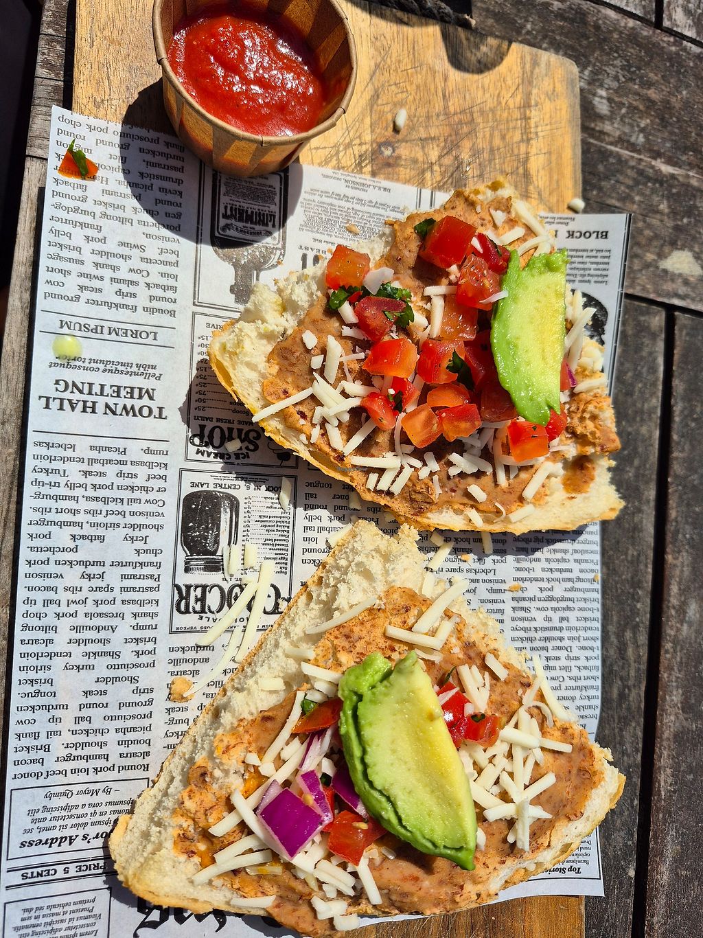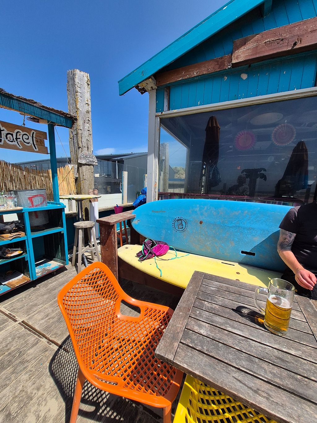 Sehr coole Beachbar. Cooler Style, Sitzbank aus Surfbrettern. Es gibt ein paar vegane/vegetarische Optionen. Wir hatten das vegane Fladenbrot. Hat super geschmeckt, allerdings echt teuer für die Größe. Auf jeden Fall zu empfehlen.