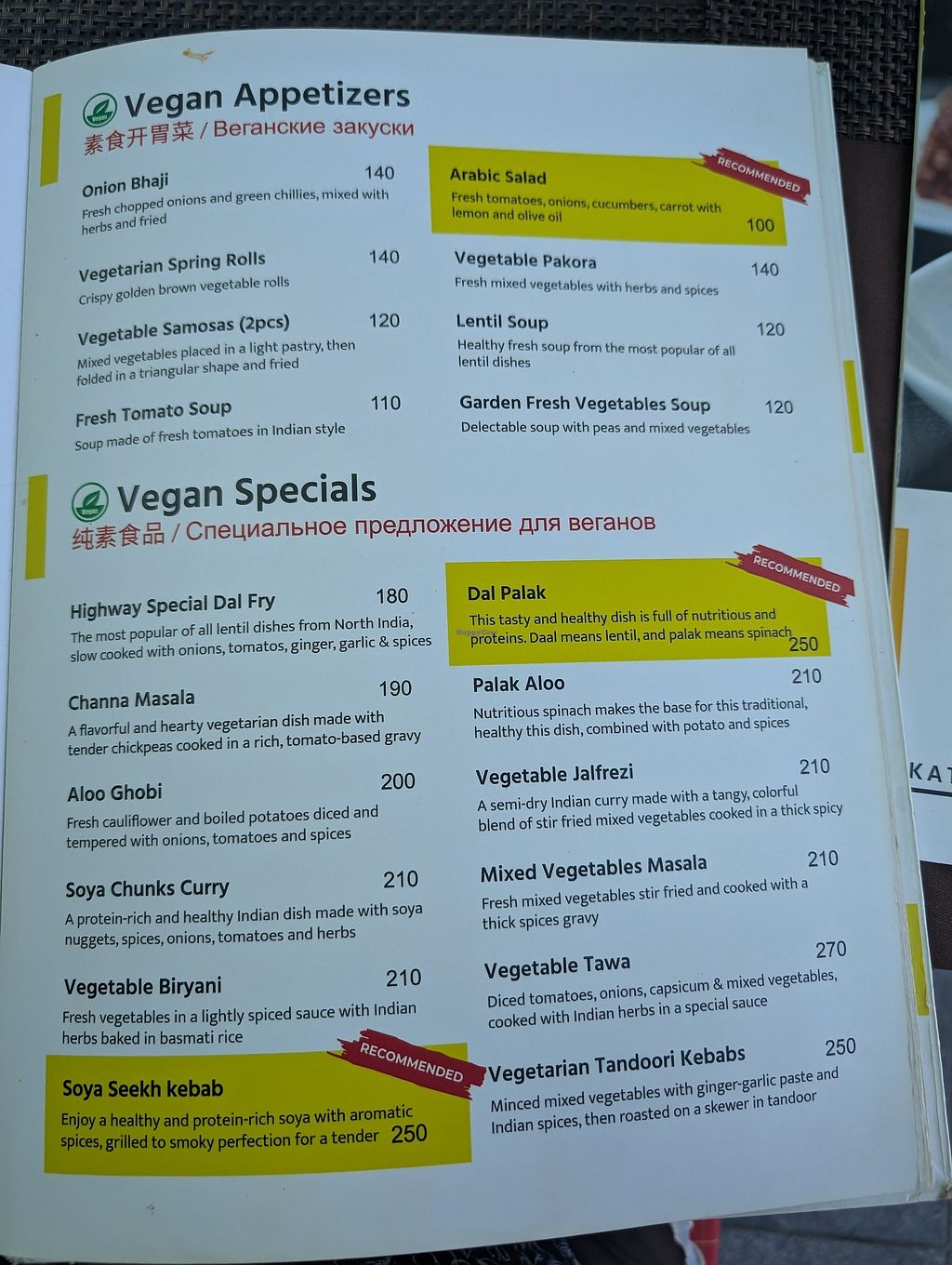 Vegan section in menu