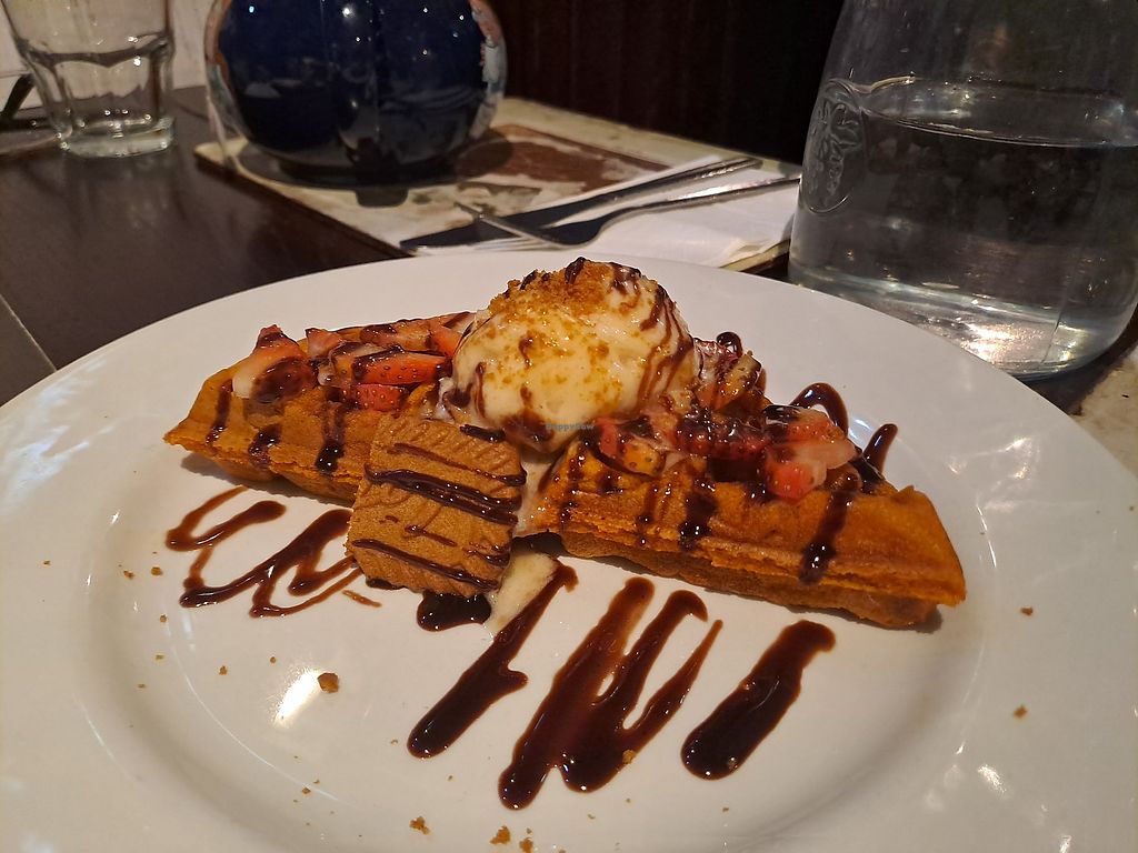 Triple cooked chips, vegan garlic bread and maple cooked Brussel sprou…