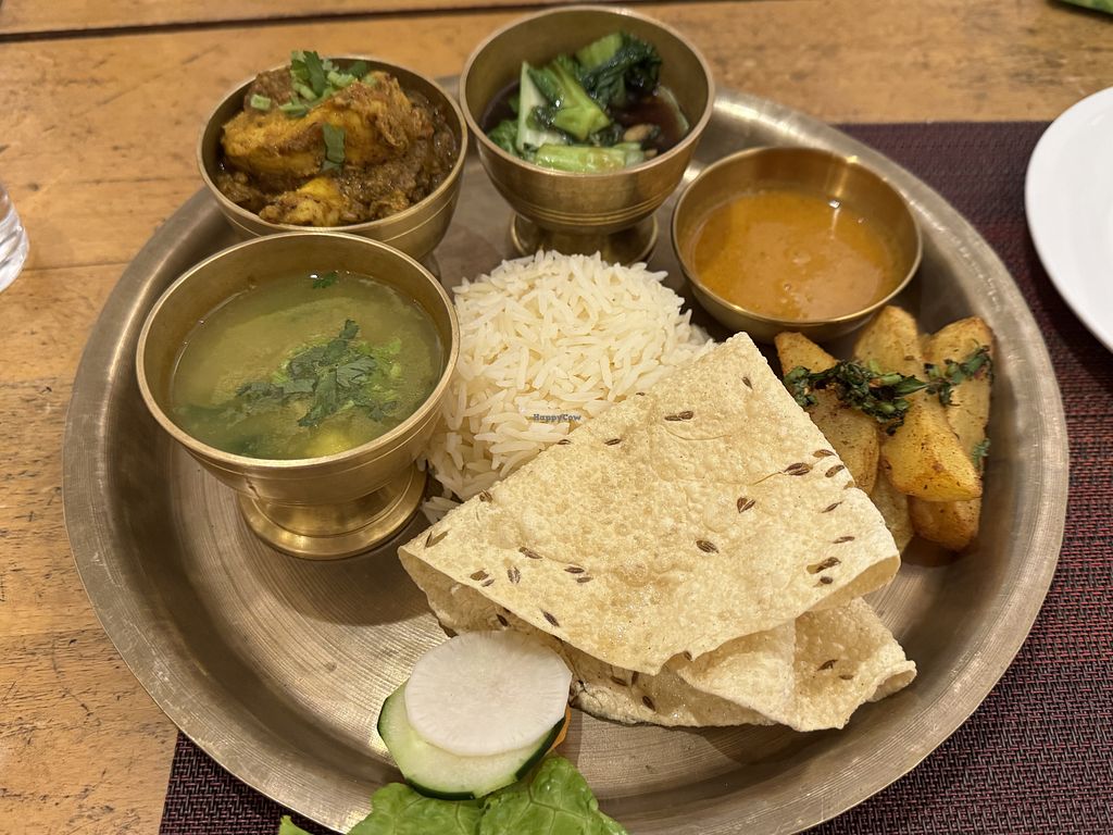 Serves meat, vegan options available. Restaurant serving dishes from Nepal and Tibet. Some dishes can be made vegan upon request - specify no dairy and no ghee. Dishes that can be made vegan include parale mushroom, vegetable samosas, pani puri, aloo chole, dal, plain roti, aloo paratha, hot and sour soup, and more. Open Mon-Sun 10:00am-8:00pm.