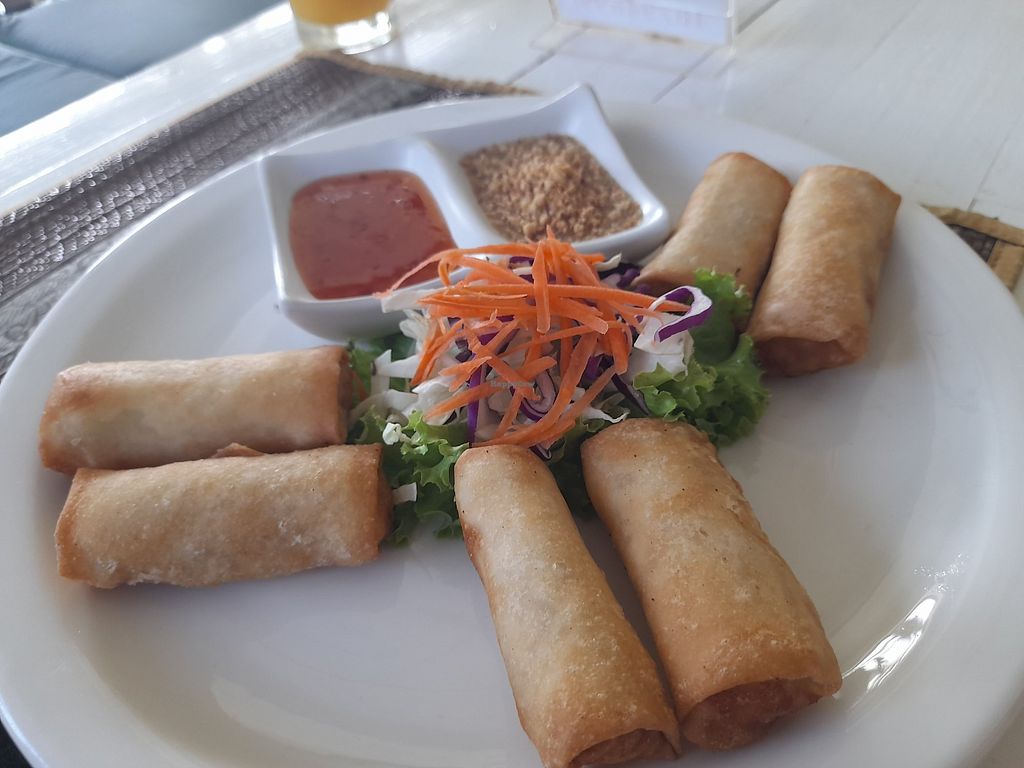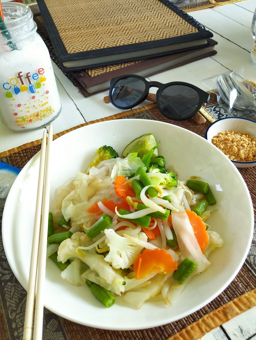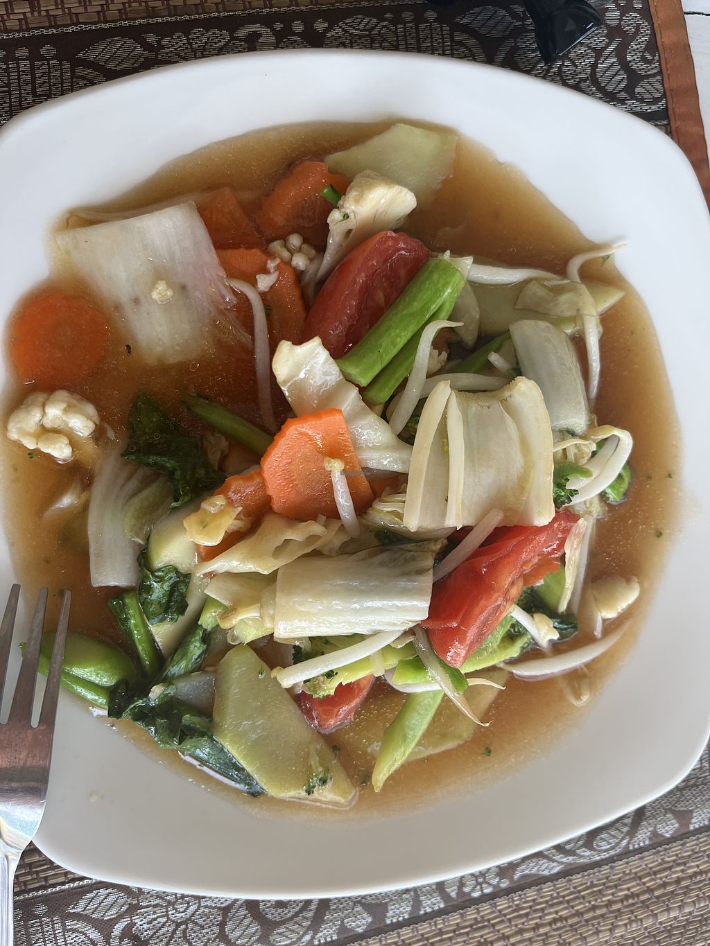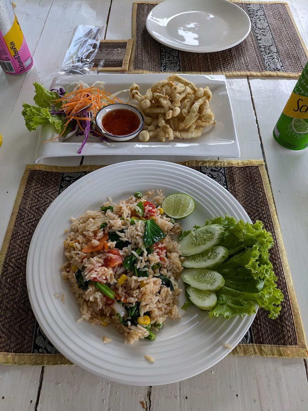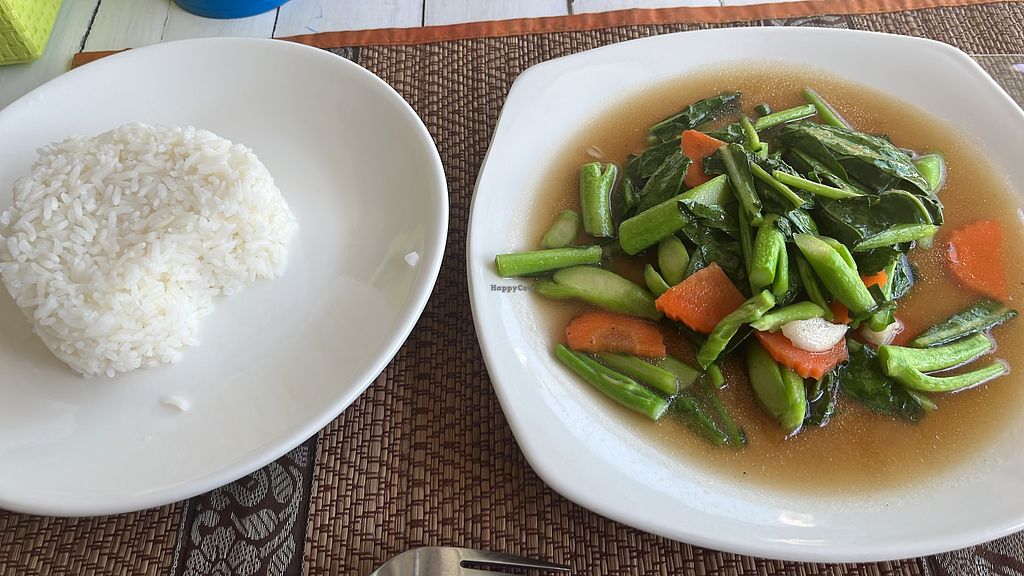 Arroz con verduras y setas fritas con salsa barbacoa picante.