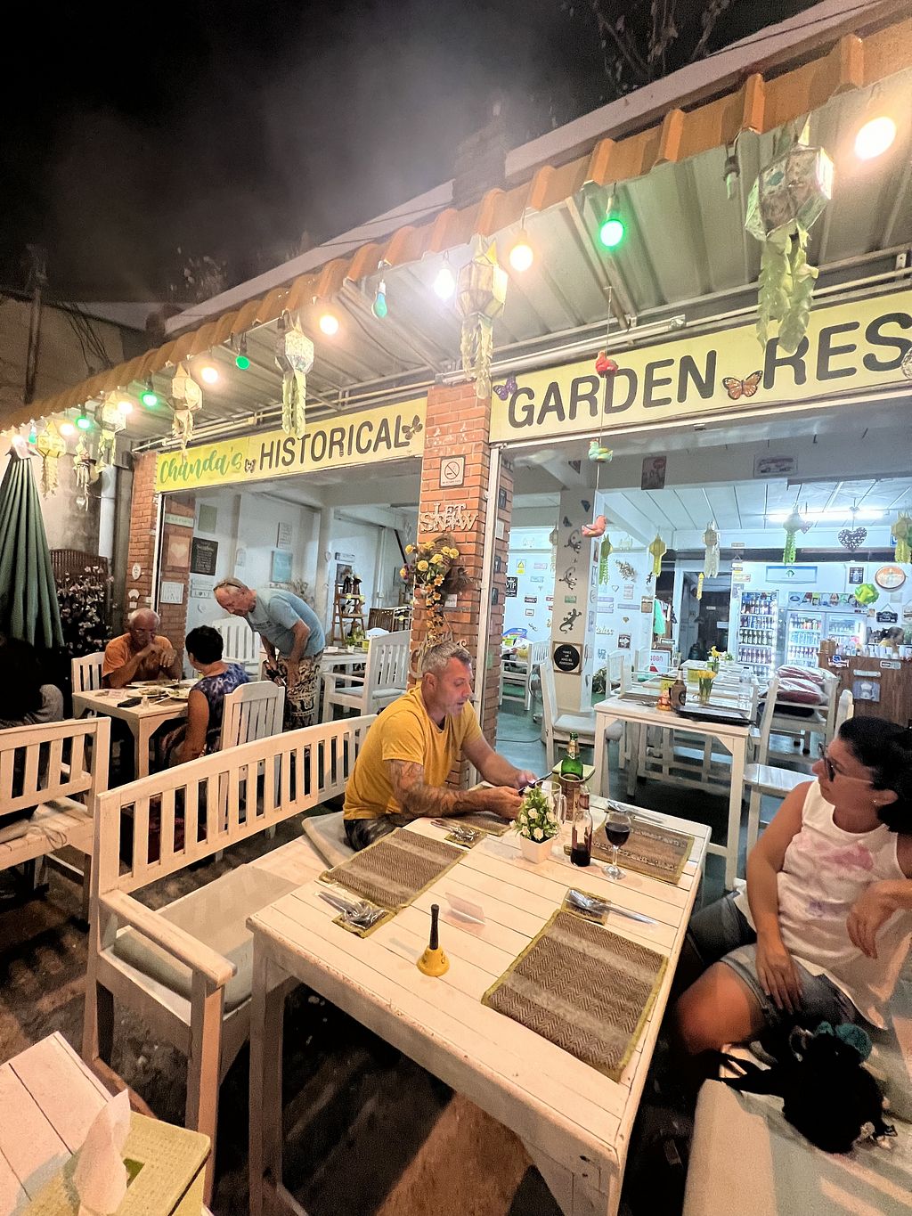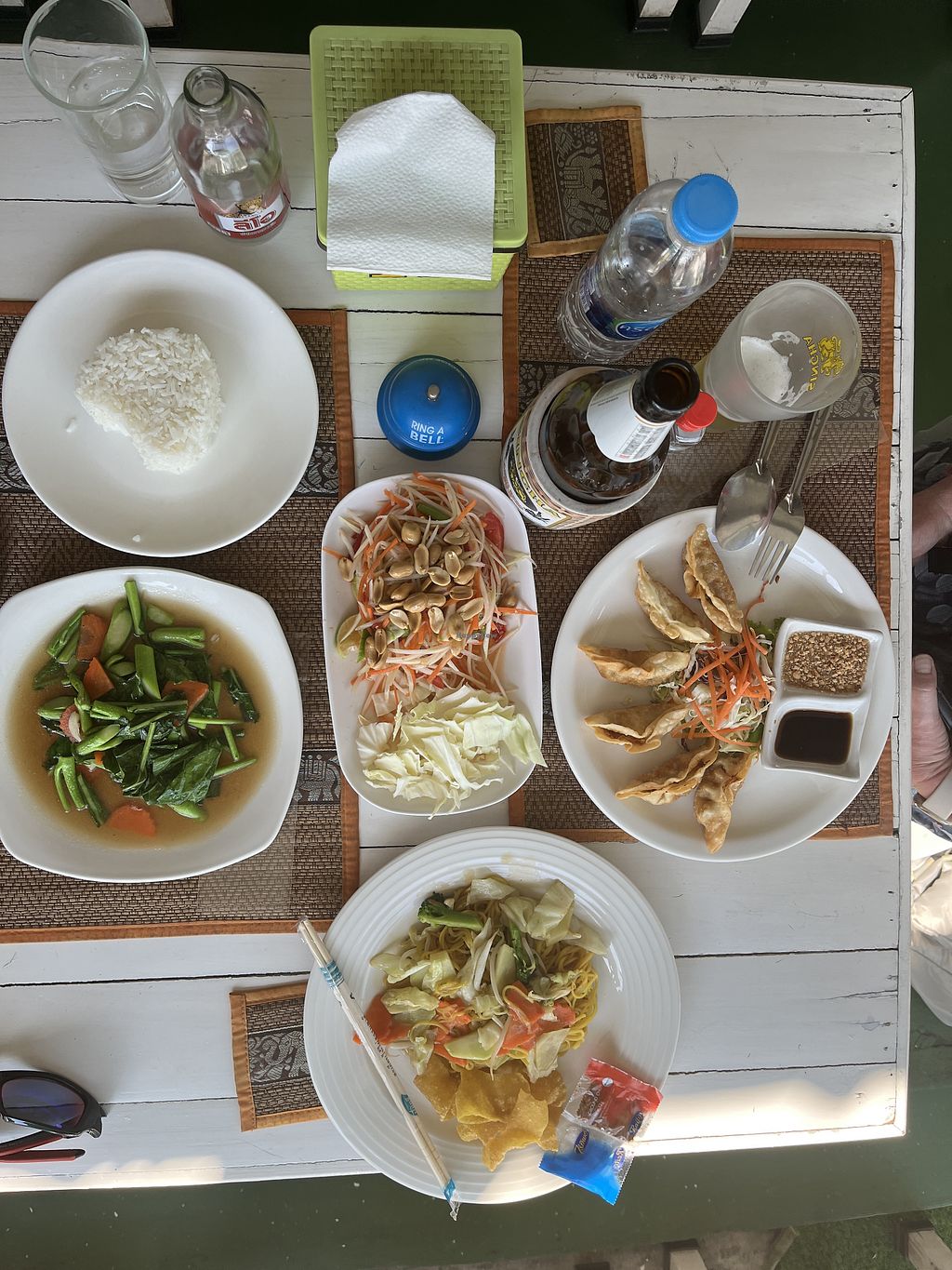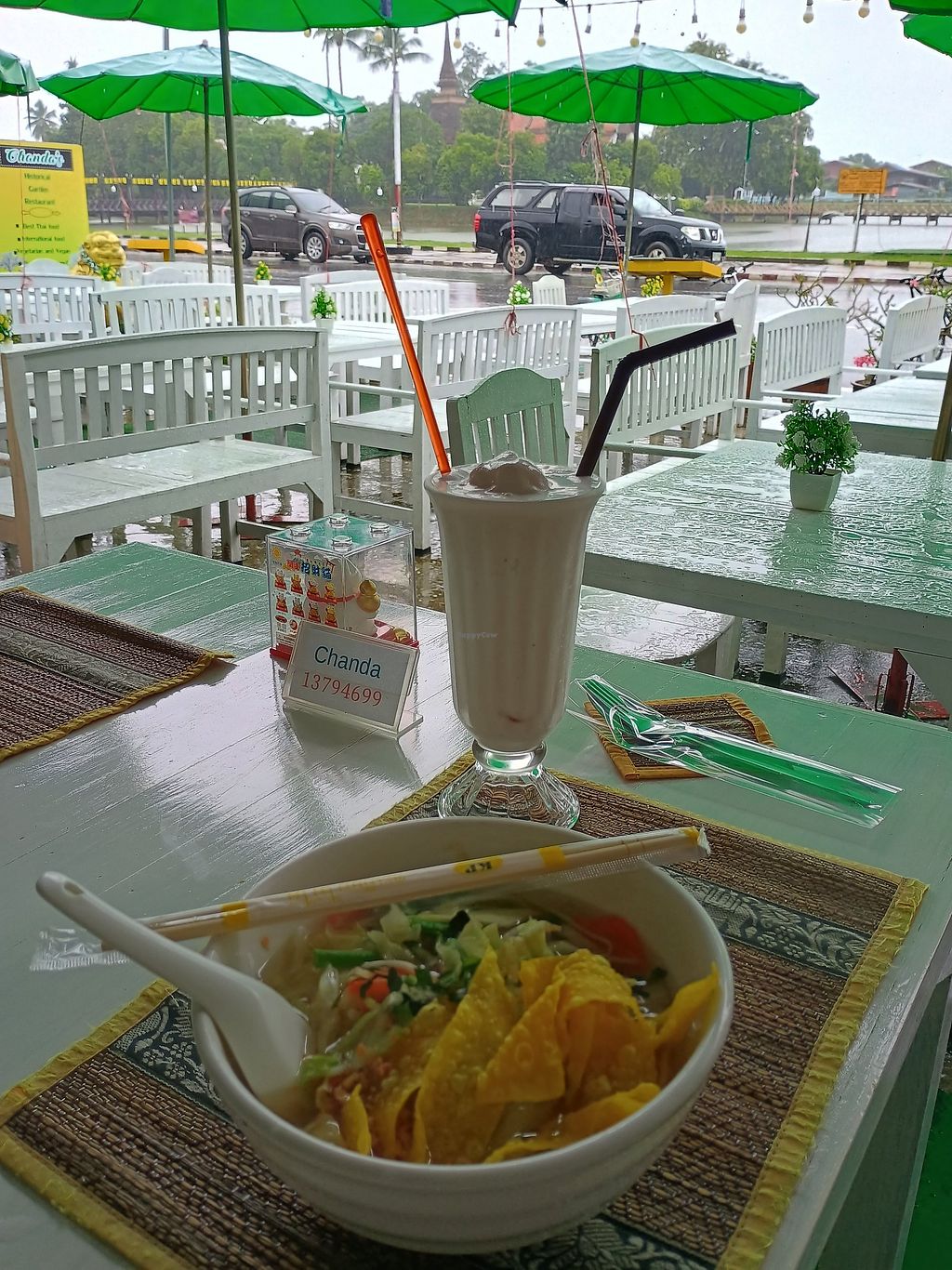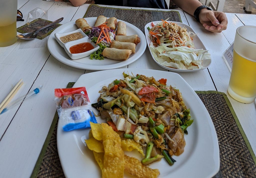 Arroz con verduras y setas fritas con salsa barbacoa picante.