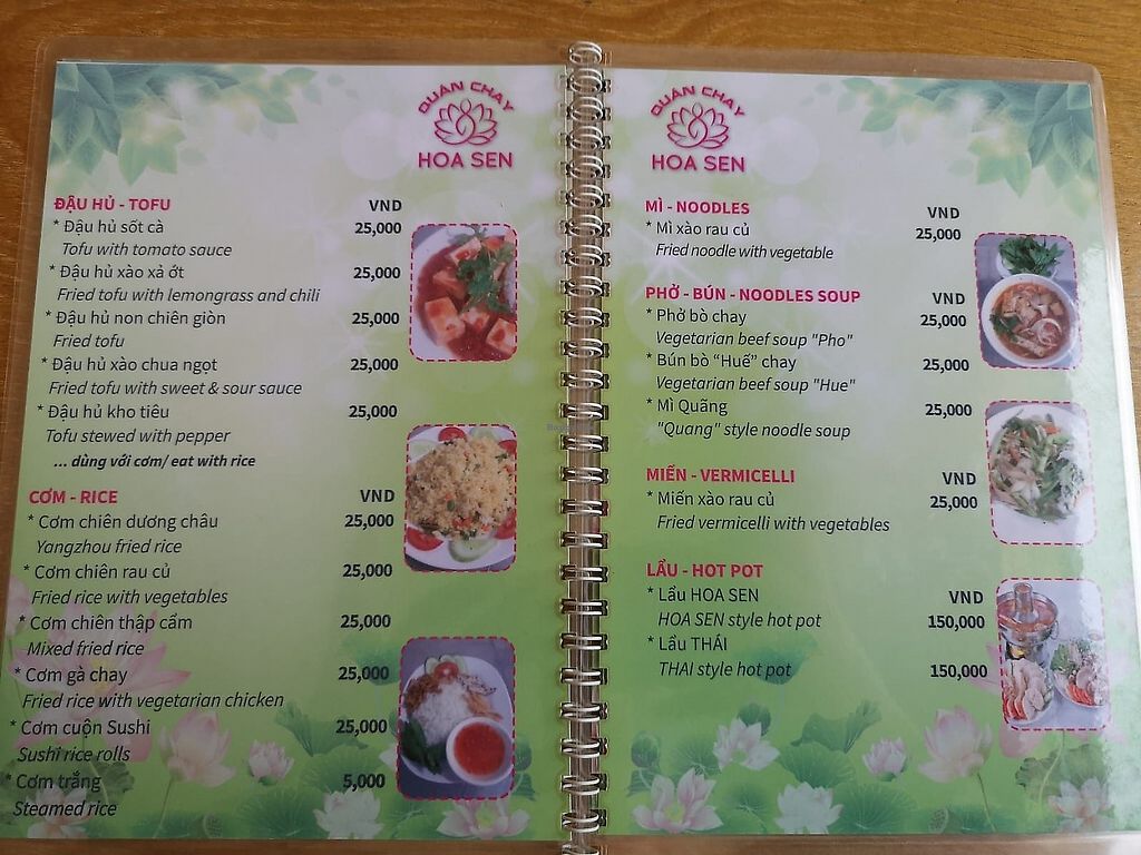 They have an amazing menu, so what to choose:). We enjoyed the tofu in tomato sauce and eggplant stew with ginger and were amazed with the nice flavors. We found this place our last evening otherwise I would loved to come back and try some more. the portions are quite small, but cheap (25k for a dish) so we were happy to order some spring rolls and a smoothie on the side.