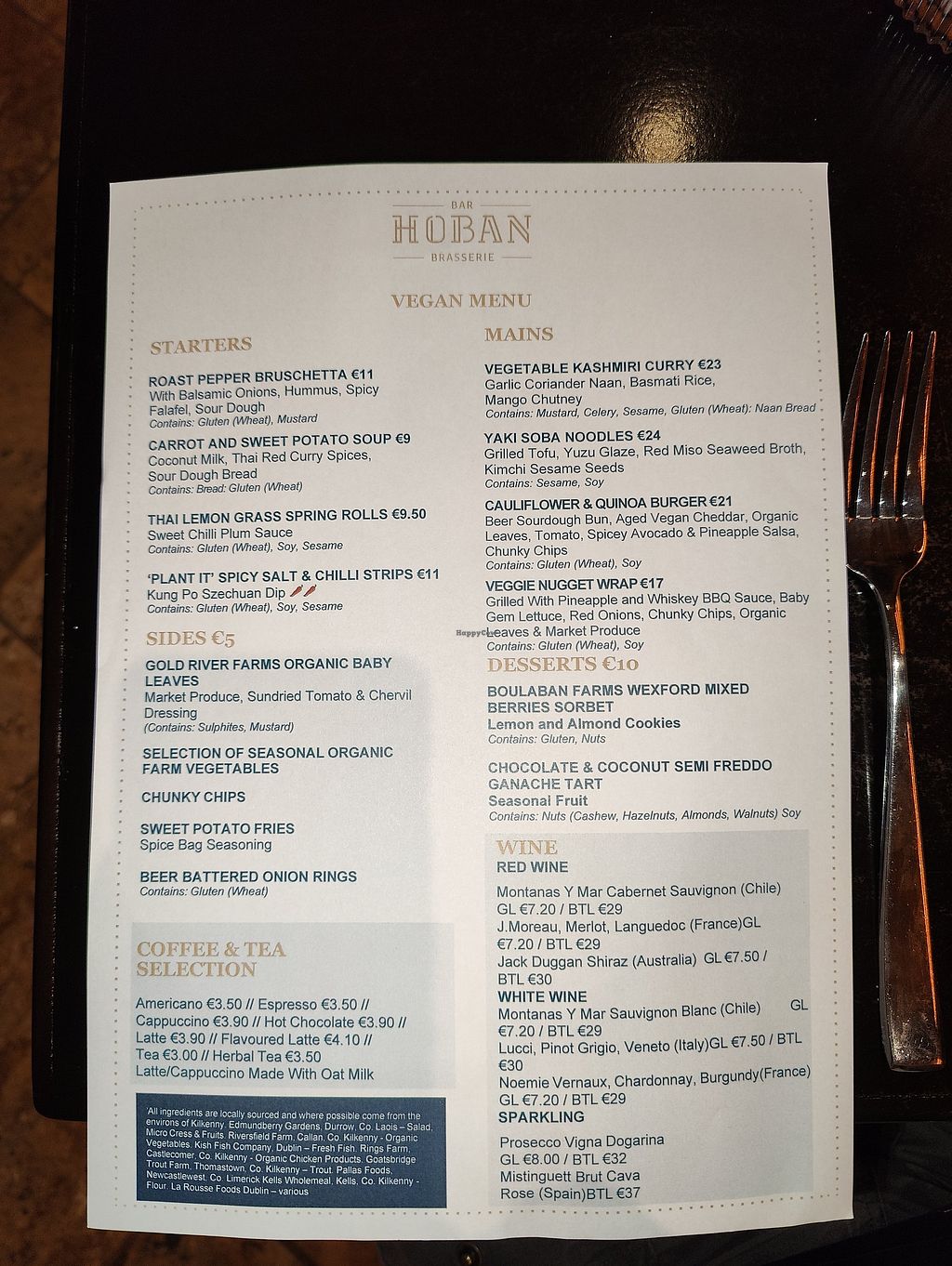 Serves meat, vegan options available. Hotel restaurant and bar with separate vegan menu. Example offerings include vegetable curry, yakisoba, vegan cauliflower burger, vegan nugget wrap and more. Open Mon-Sun 17:30-00:00.