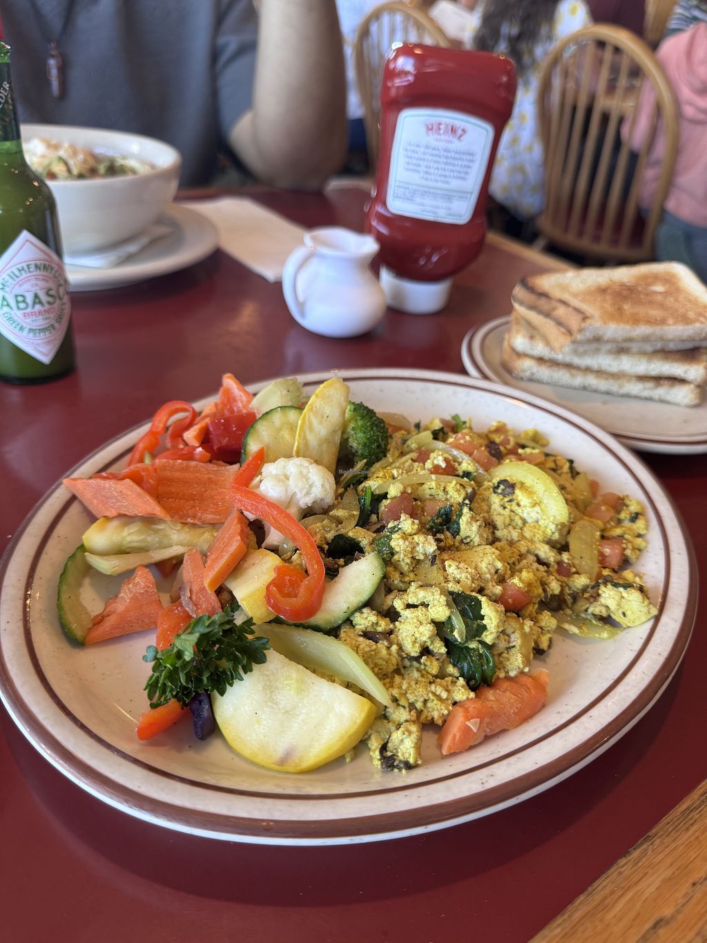 Tofu scramble was good maybe a little too much turmeric. Large portions so a good deal. Had enough for two meals. They had soy milk to sub, which was nice! Parking was tough but we parked in the hotel lot behind though there was a tow sign so do at your own risk. We were there for almost two hours without a problem.