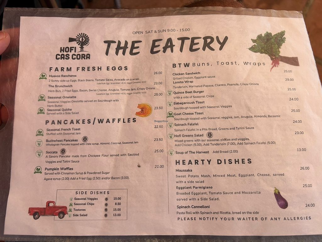 Op Hofi Cas Cora verbouwt men groente en fruit, er worden ook dieren gehouden. Door de weeks kun je luchen in De Marketplace”. De vaste kaart van de “Marketplace” is beperkt, men serveert wat op dat moment geoogst is. Er zijn sappen, salades, broodjes. Van de laatste twee zijn er een paar vegan opties. Behalve groente en fruit zijn ook wat milieuvriendelijke non-food artikelen te koop.