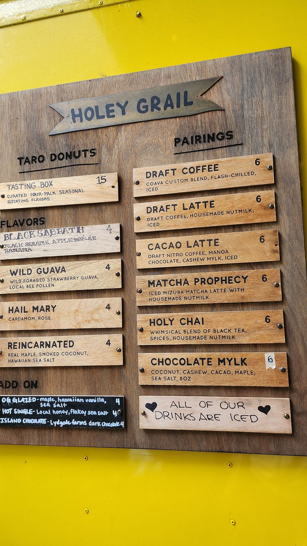 Donut shop offering taro donuts which are fried in coconut oil. Dough is plant-based. Also makes fresh nut milk for beverages. Note that honey may be present in some items. Currently offering 7 different donut flavors; 4 which rotate weekly and 3 that are kept on the menu year-round. Reported closed February 2024.