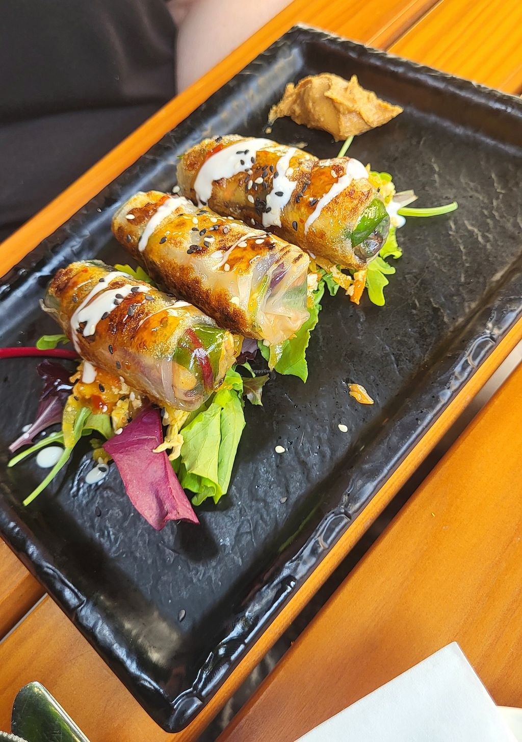 Rice wraps filled with smoked tofu and vegetables, topped with sprouts