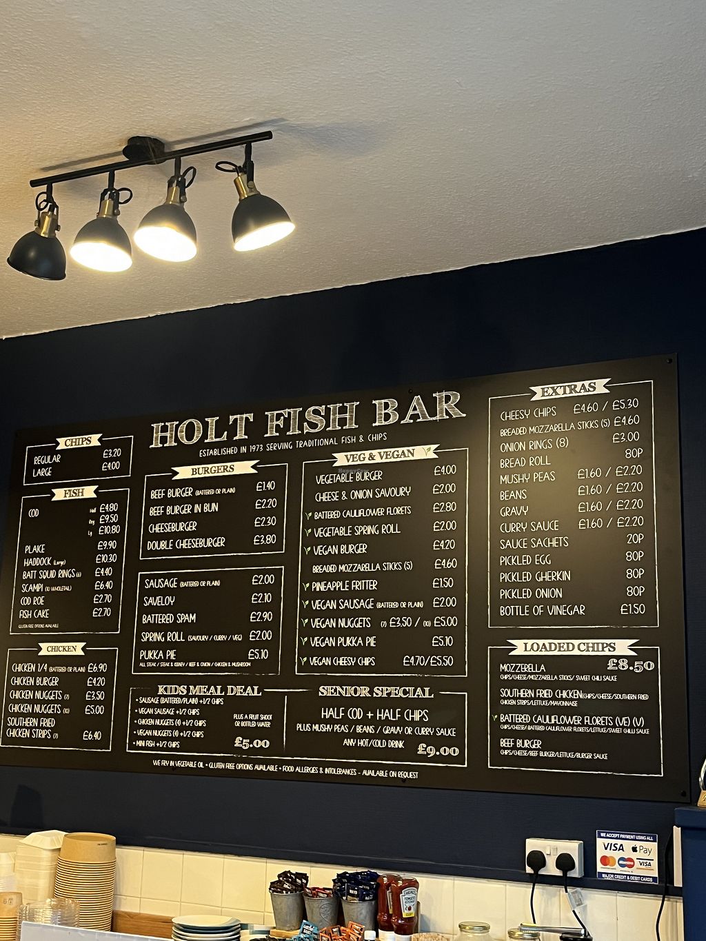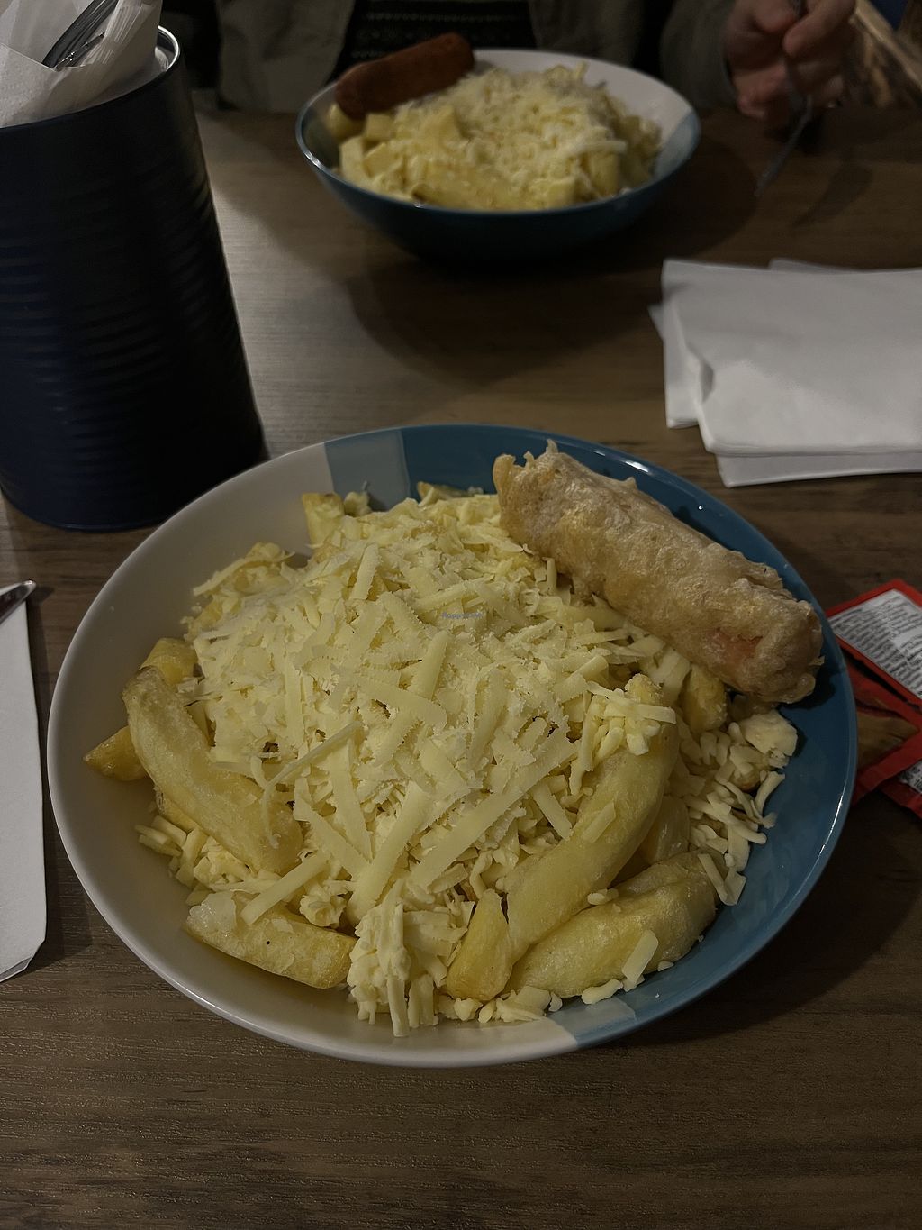 Vegan cheesy chips and battered sausage