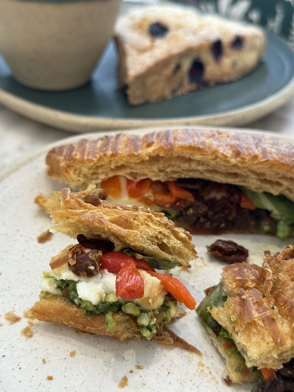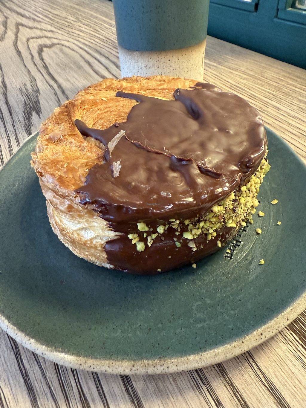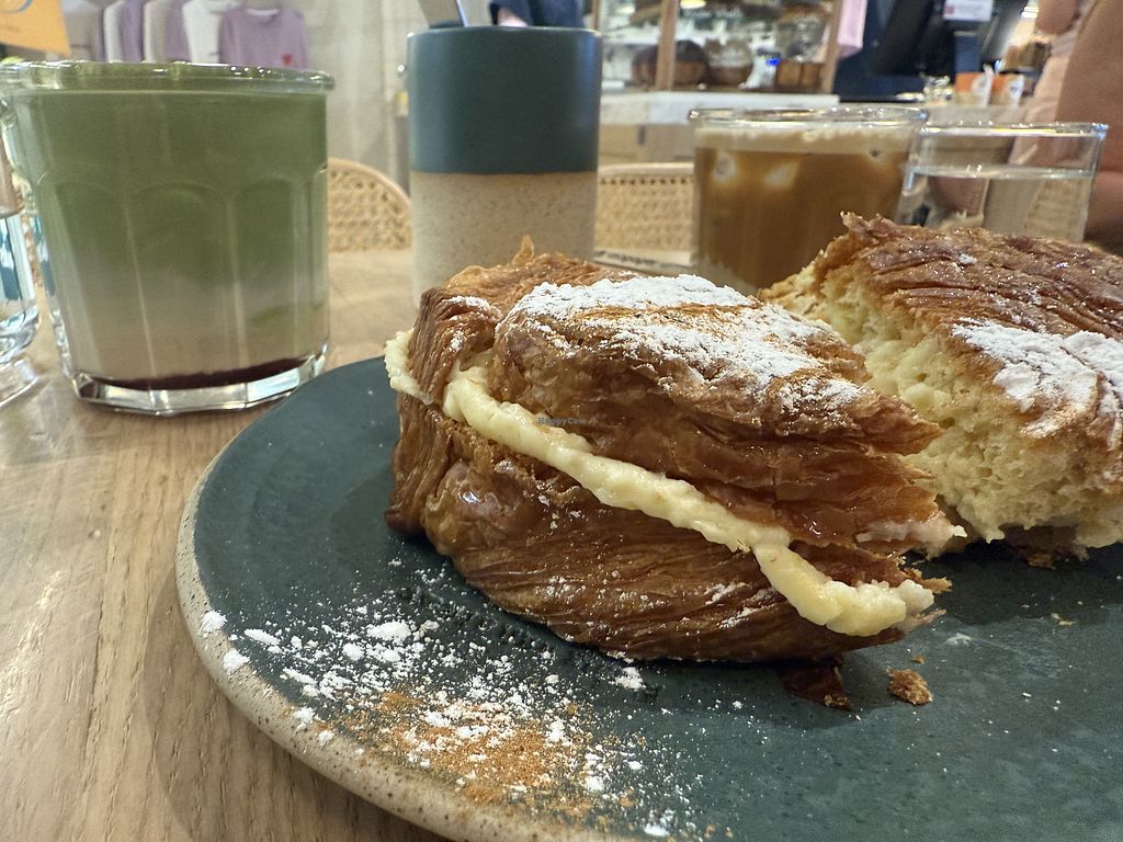 Cruffin and Bugatsa with Flat White and Strawberry Matcha