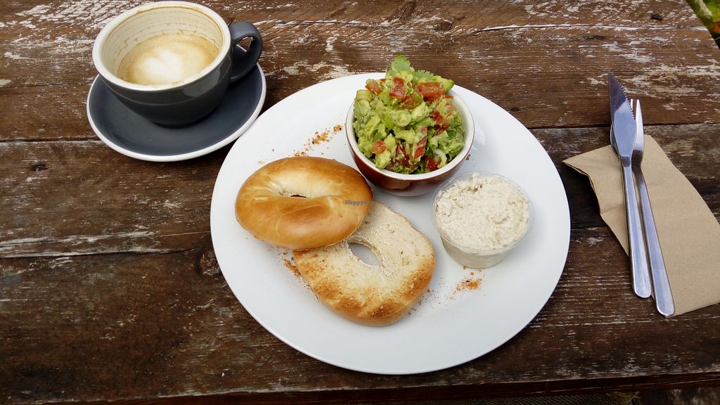 Vegan bagel, home made cashew cheese and home made guacamole.