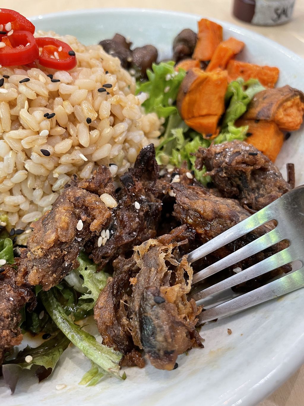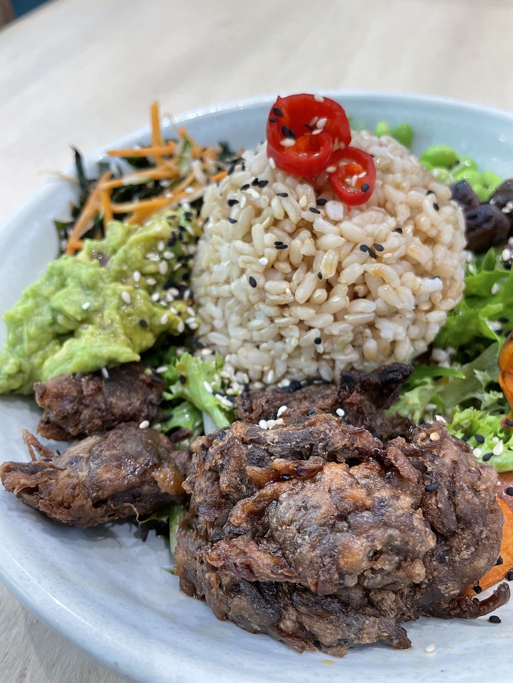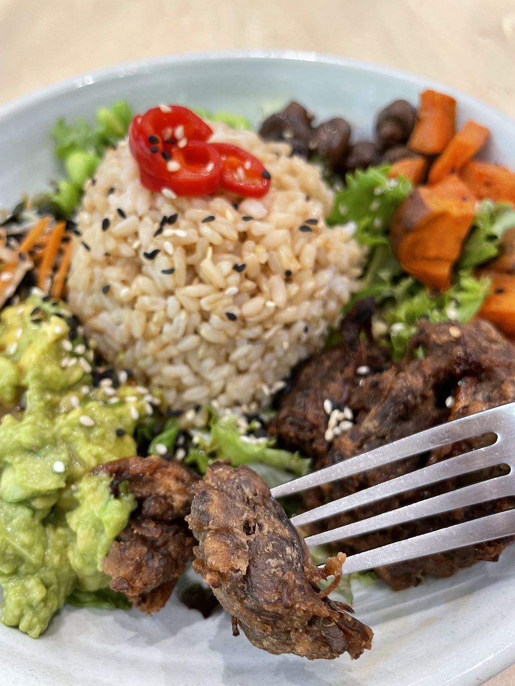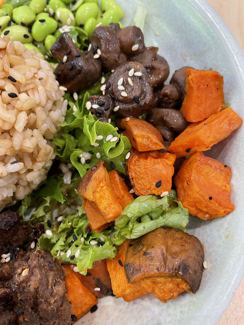 With avocado smash, lettuce, edamame, mushrooms and sweet potato all served around rice
