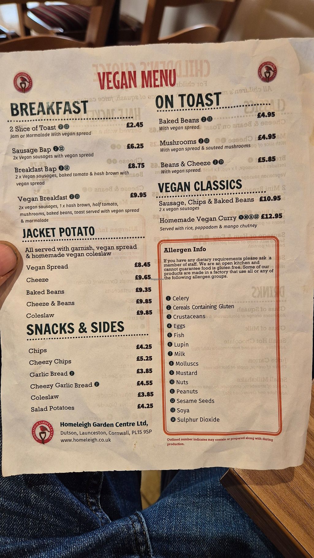 Separate Vegan menu. Fairly basic and small menu, but Breakfast, snacks and a few lunches. Vegan cakes as well.