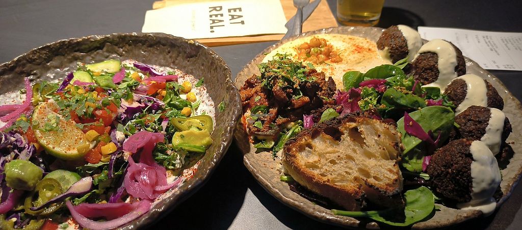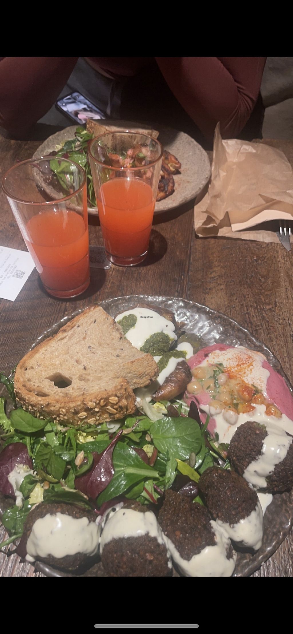 Always a long queue to get in but that means they're doing something right. Open kitchen. Food was great and price is good. I had the hummus, the falafel and the herb tofu. Bread and crudités had to be ordered separately. The Tofu and falafel were accompanied by a really nice salad and toasted bread. Service was good and food arrived quickly. Lots of choice. Will definitely come back , I strongly recommend.