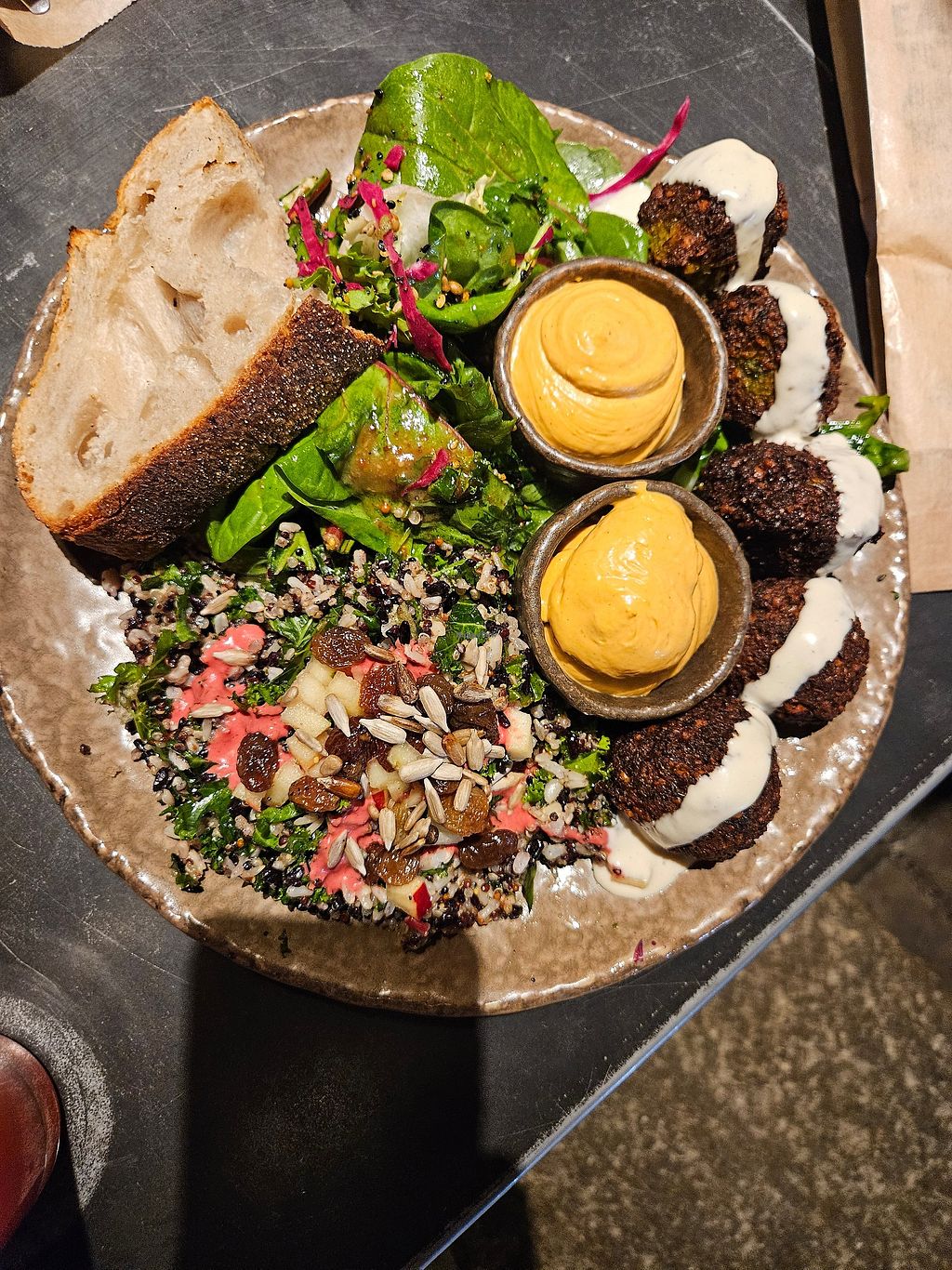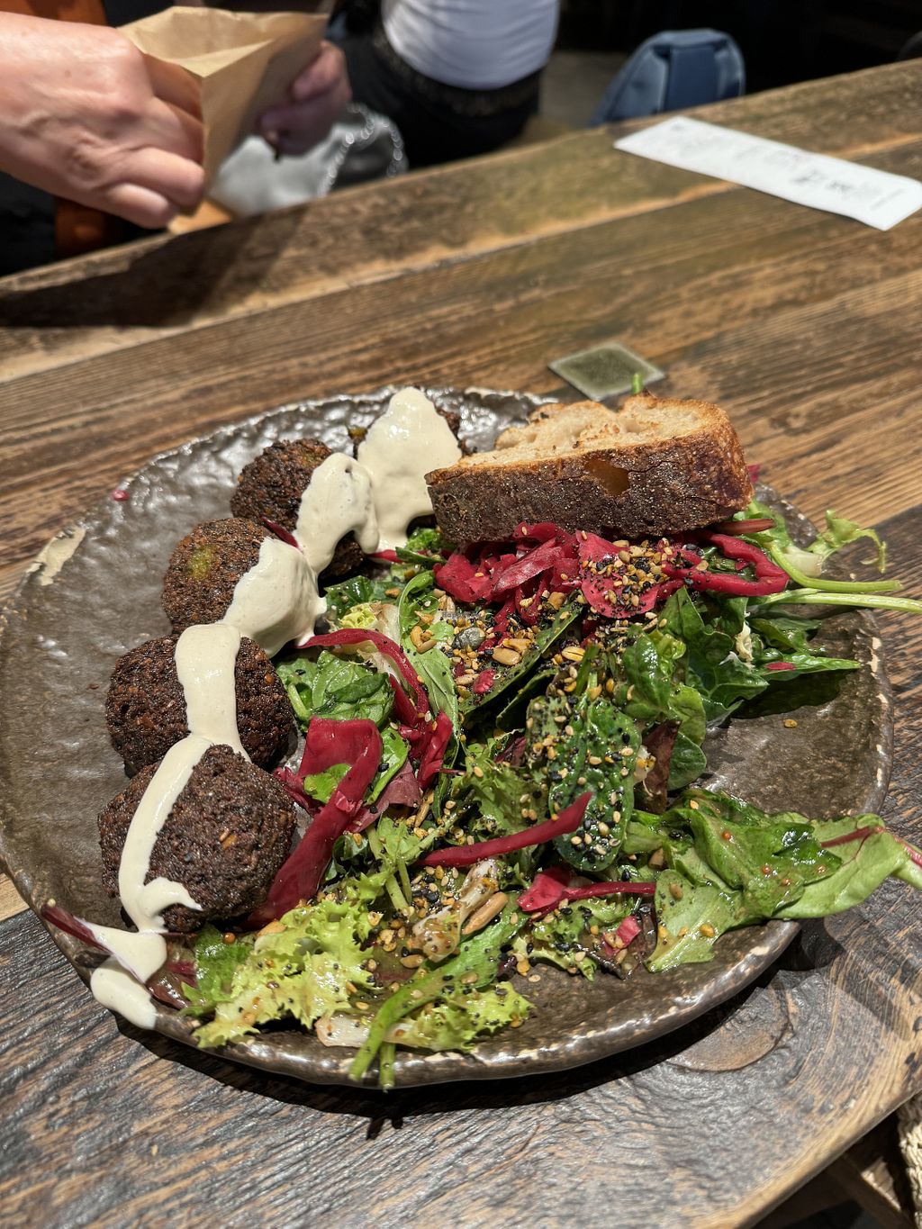 The falafel plate was soooo good as well as the miso cheese cake. The atmosphere and decor is really cool.