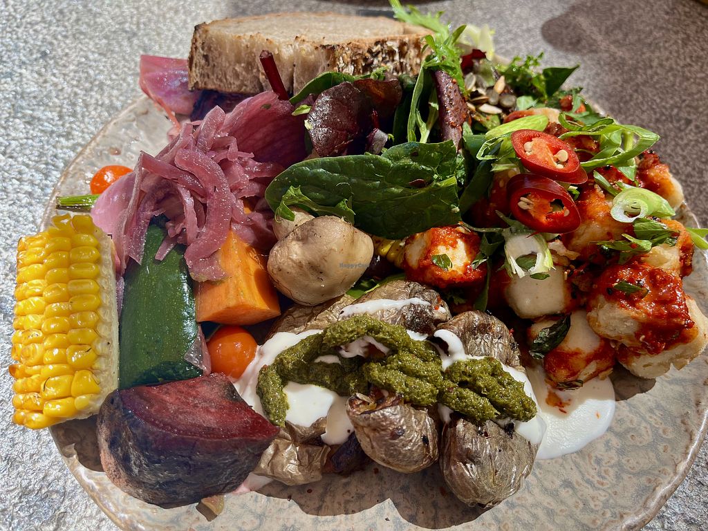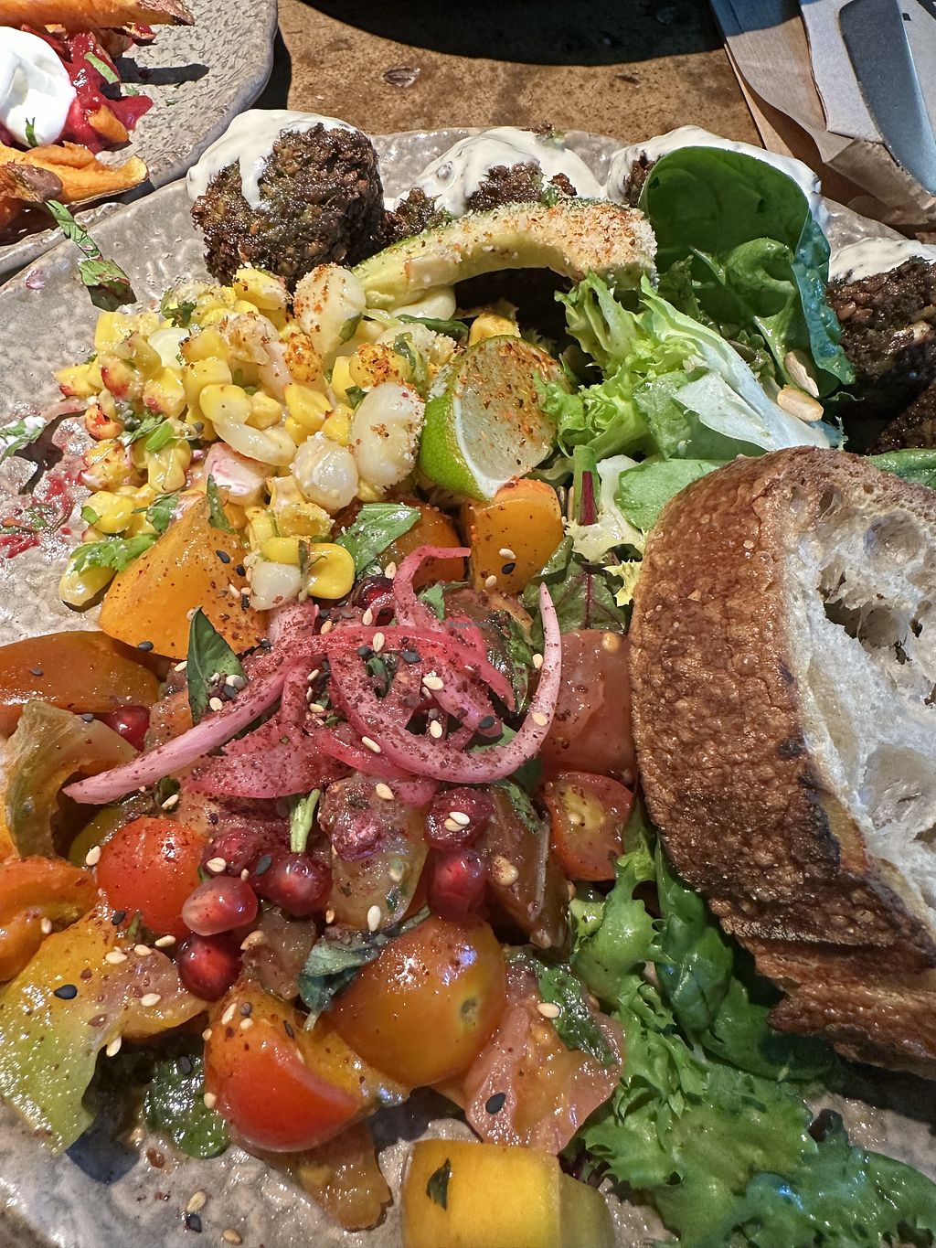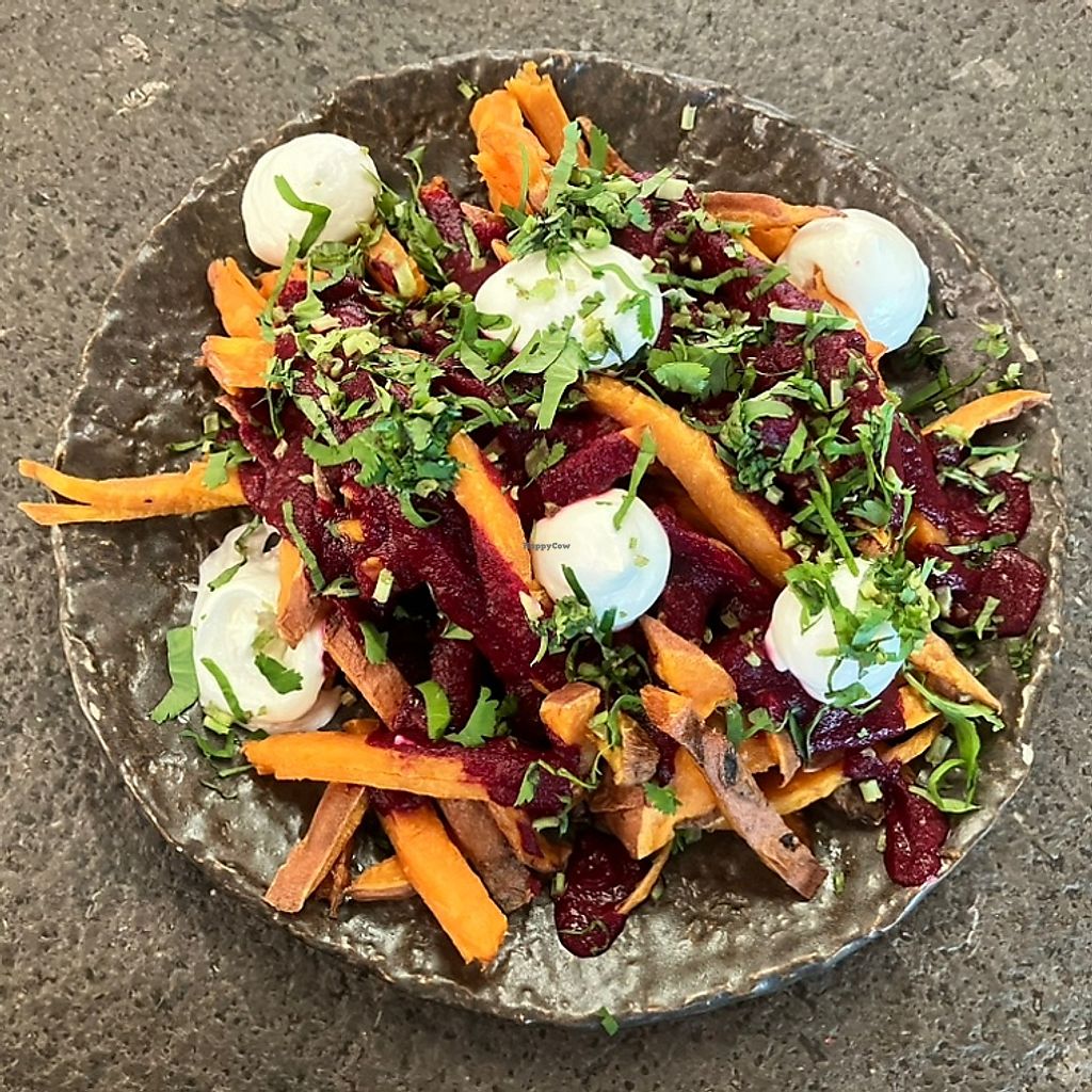 Sweet potato fries with beetroot ketchup and vegan sour cream