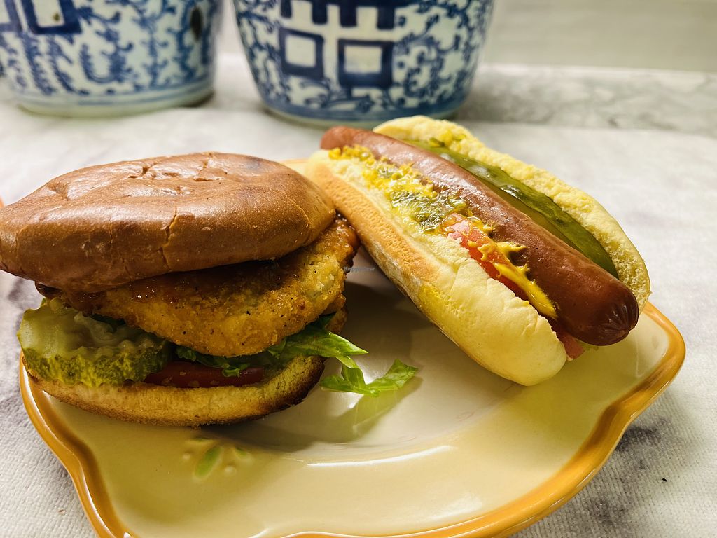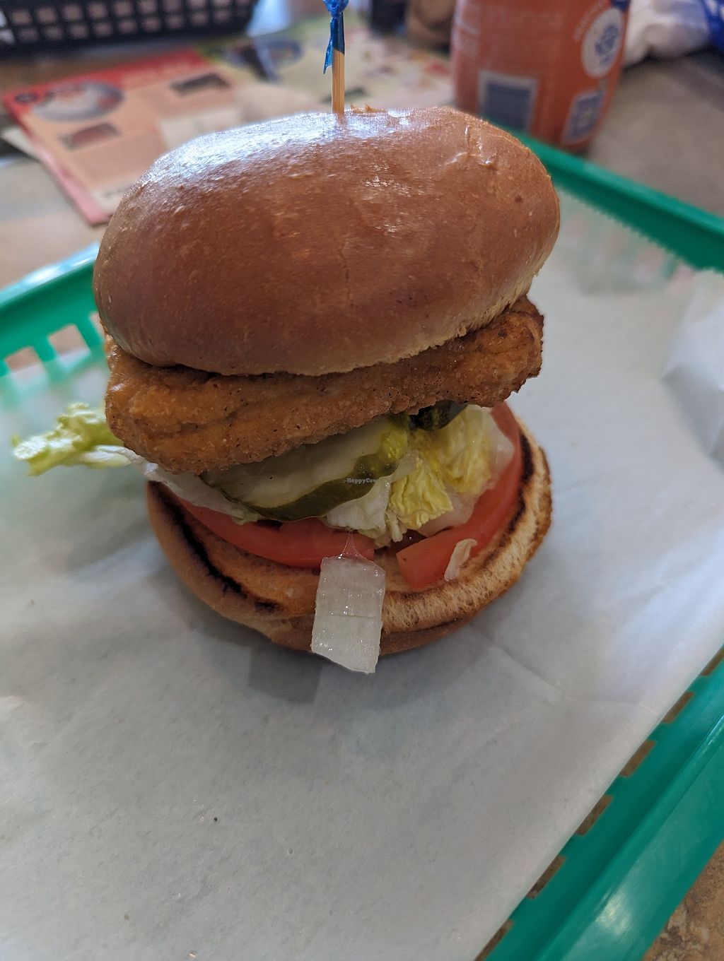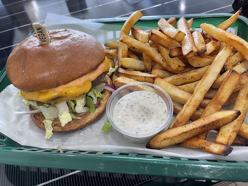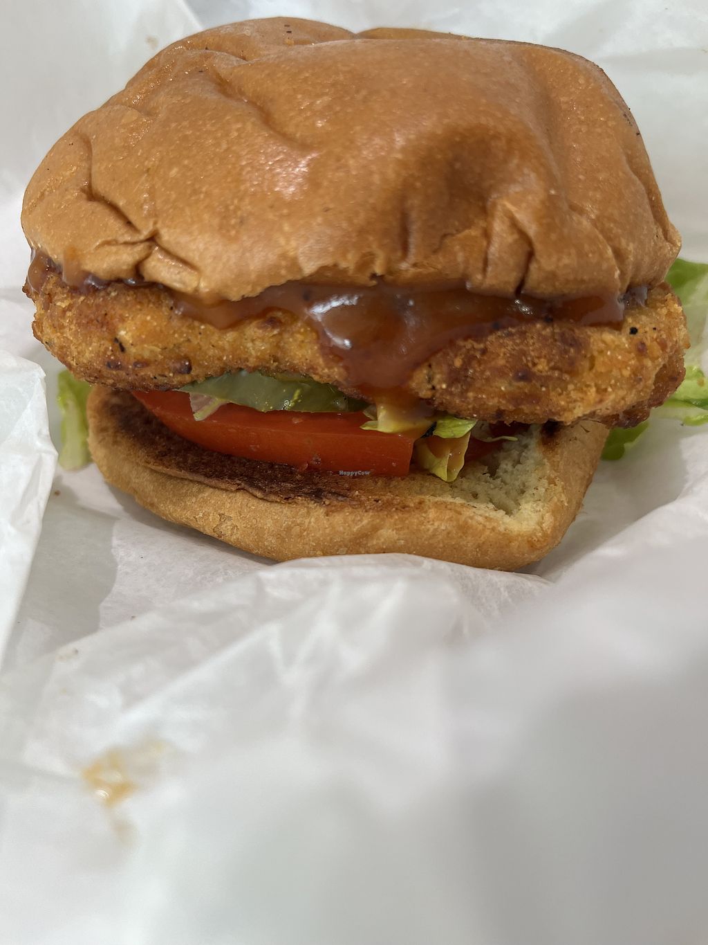 Buffalo Chick’n Sandwich with fries and spicy sauce