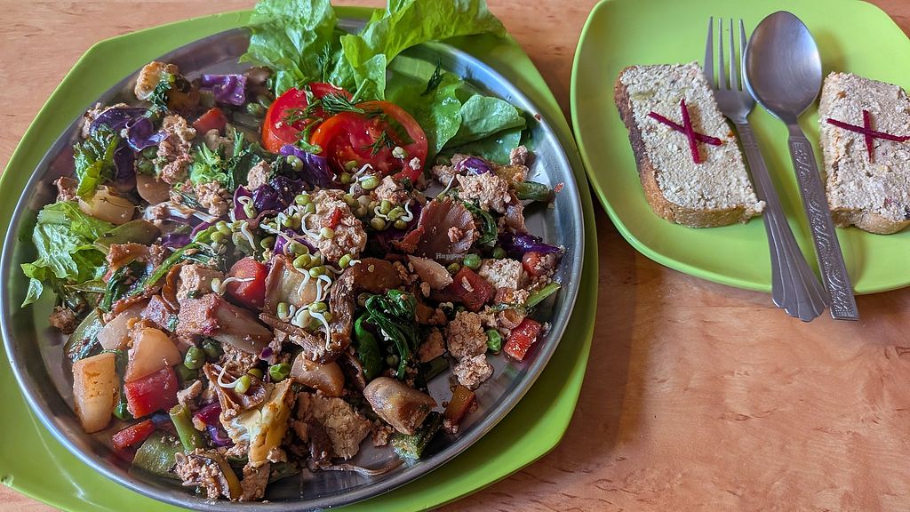 Tofu scramble, ice coffee chocolate and coconut shake and brownie