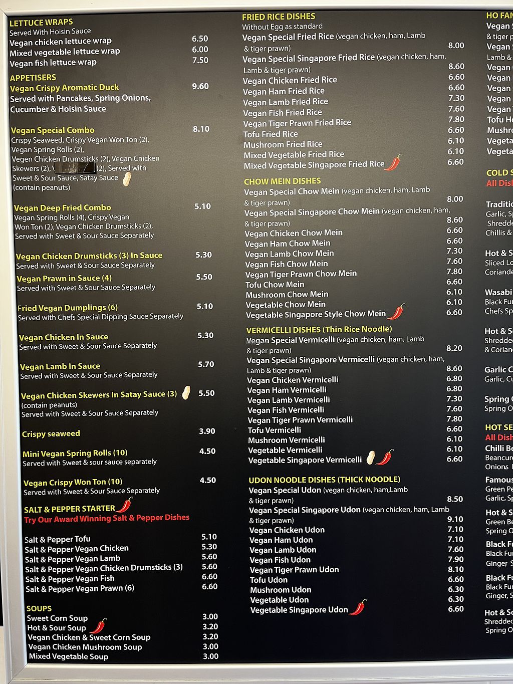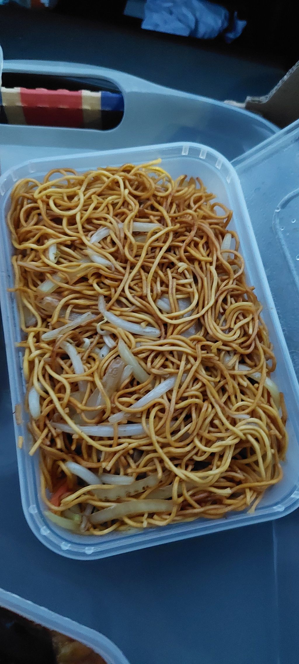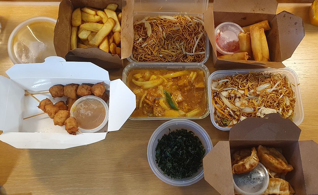 Curry sauce, chips, satay chicken skewers, Chow mein side, tofu satay,…