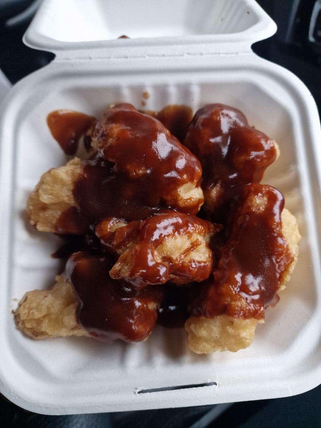 Having not had a chippy since I stopped eating meat, this was tremendous! Battered sausage with sweet potato chips…tasted great. Will be back :)