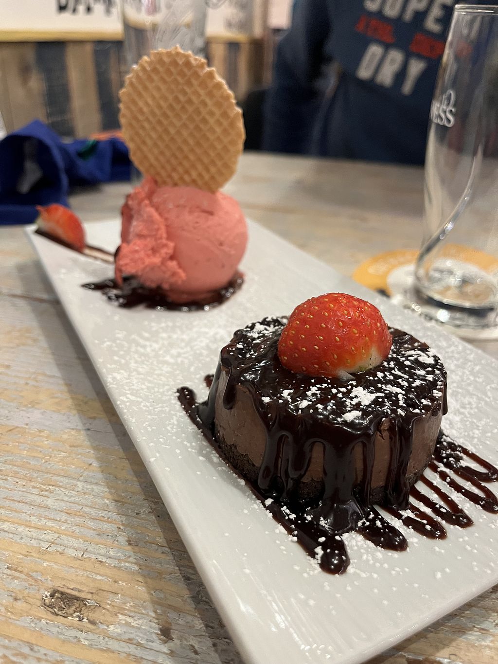 Vegan chocolate cheesecake with vegan strawberry ice cream. Delicious …
