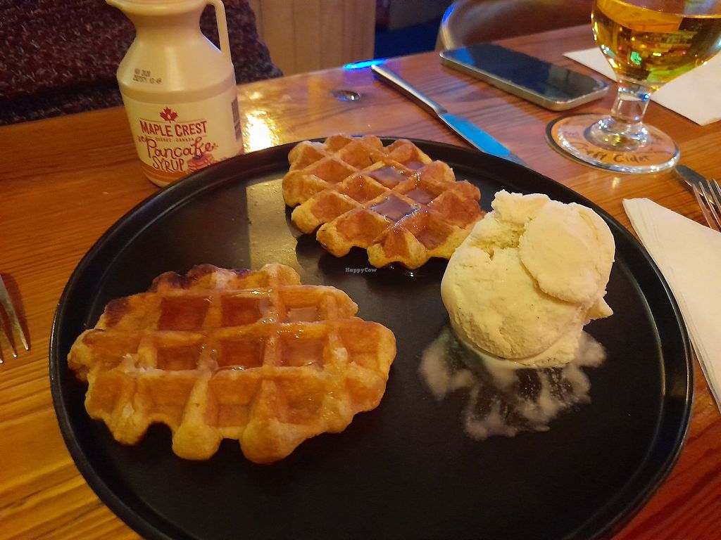 Waffles with ice cream and maple syrup