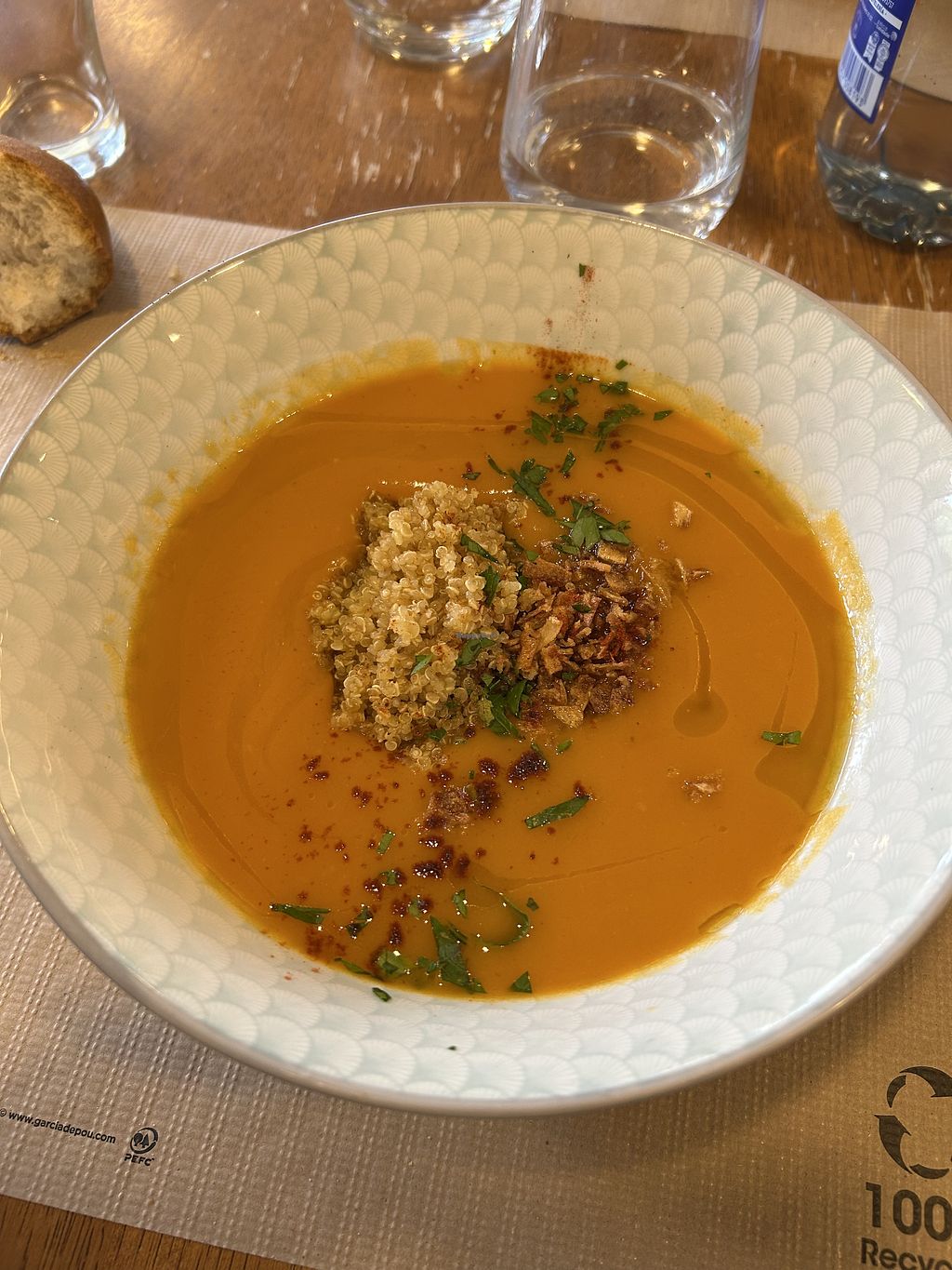 Platos veganos sabrosos y contundentes! Comimos de menú que incluía dos platos con una generosa ración de buen pan, bebida y postre por 17 euros. En mi caso pedí dos primeros que eran veganos pero me dijeron que podía elegir un segundo plato de la oferta vegana que tienen en carta si lo prefería. De postre me ofrecieron piña glaseada, opté por café con leche de soja.