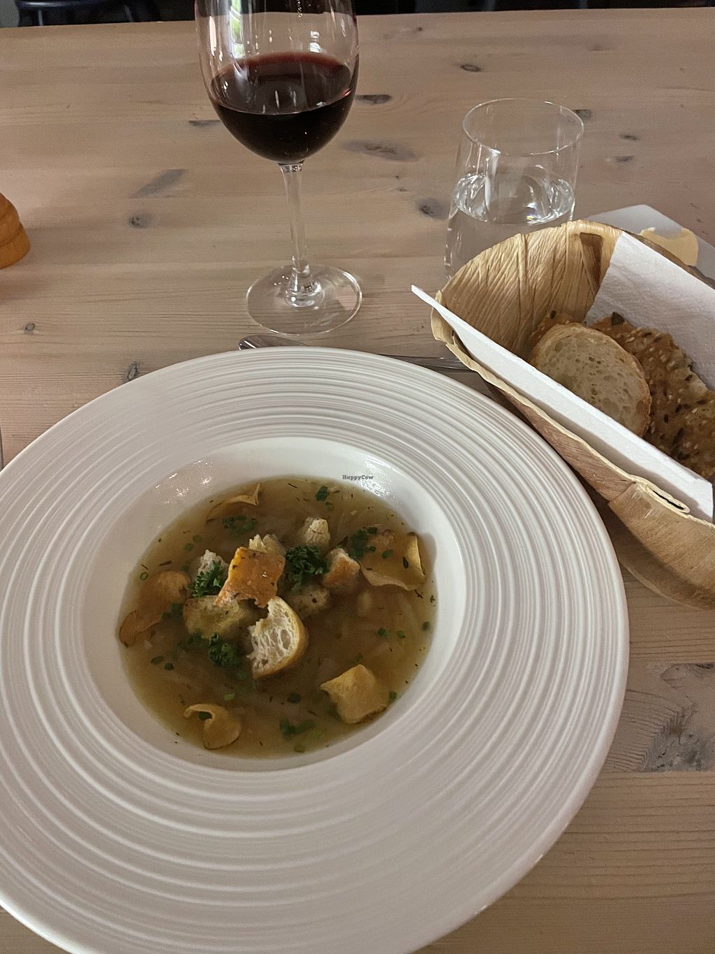 Onion soup with bread and the best vegan butter I’ve had!
