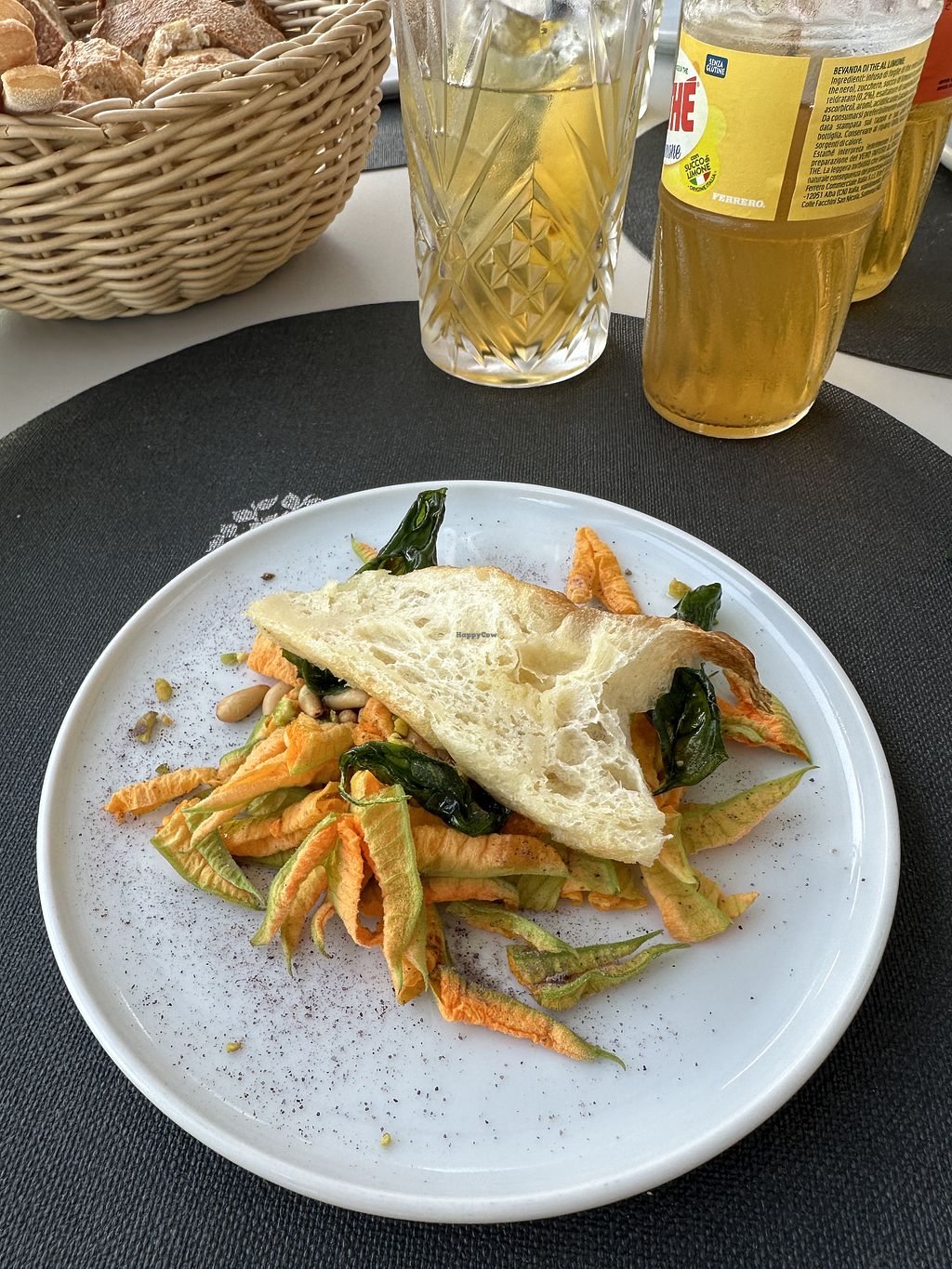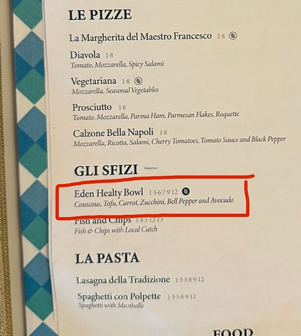 Ristorante Adamo Ed Eva includes: Buffalo Caprese Salad, Pistachio Mango Stuffed Cannelloni, Beet ravioli, Lemon pasta, & a Seitan Fillet with Quinoa, Seitan Fillet, Tofu Bowl, & fried eggplant