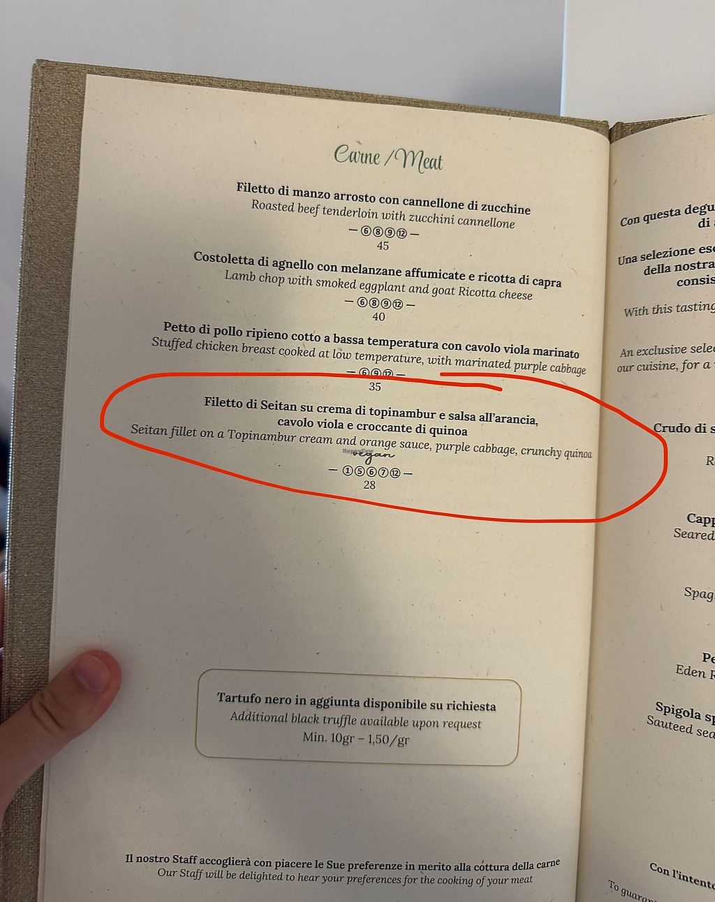 Definitely would come back give the other vegan dishes a shot. Love the clear labels. Would recommend trying the Seiten at the other ristorante in this hotel