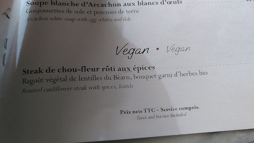 Le plat vegan (une grosse et généreuse tranche de chou fleur travaillée rôtie avec une sauce aux épices et curry) est absolument bluffant.