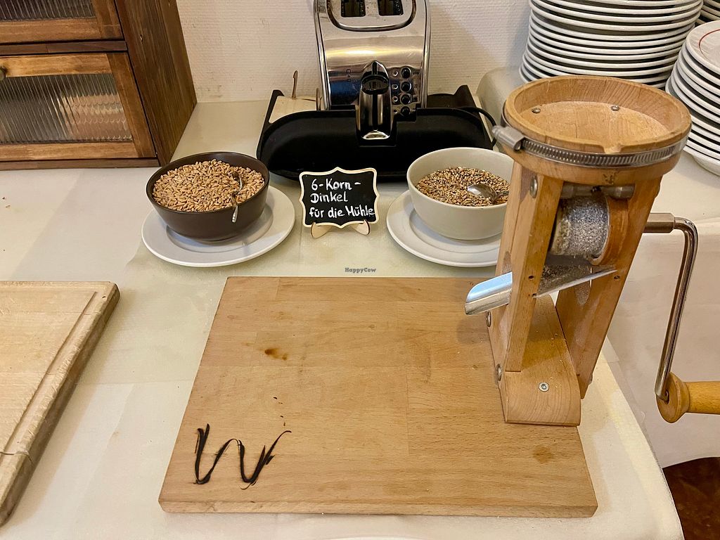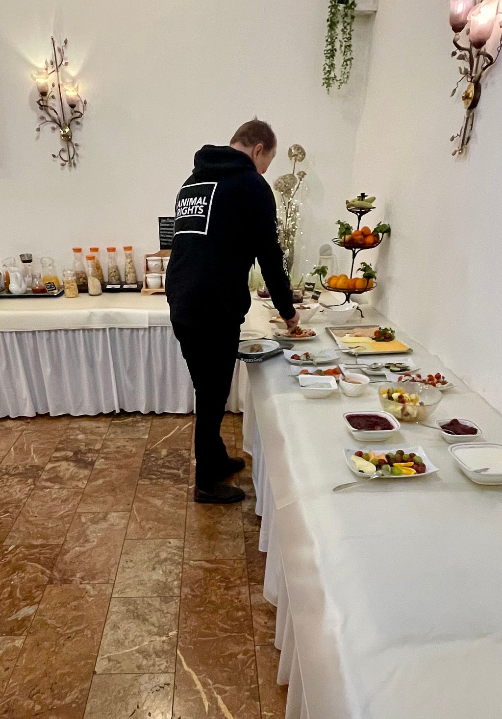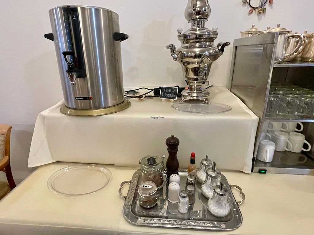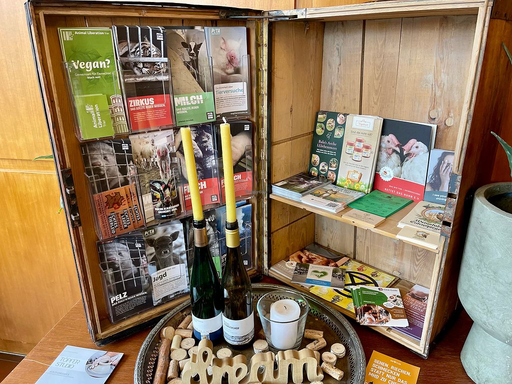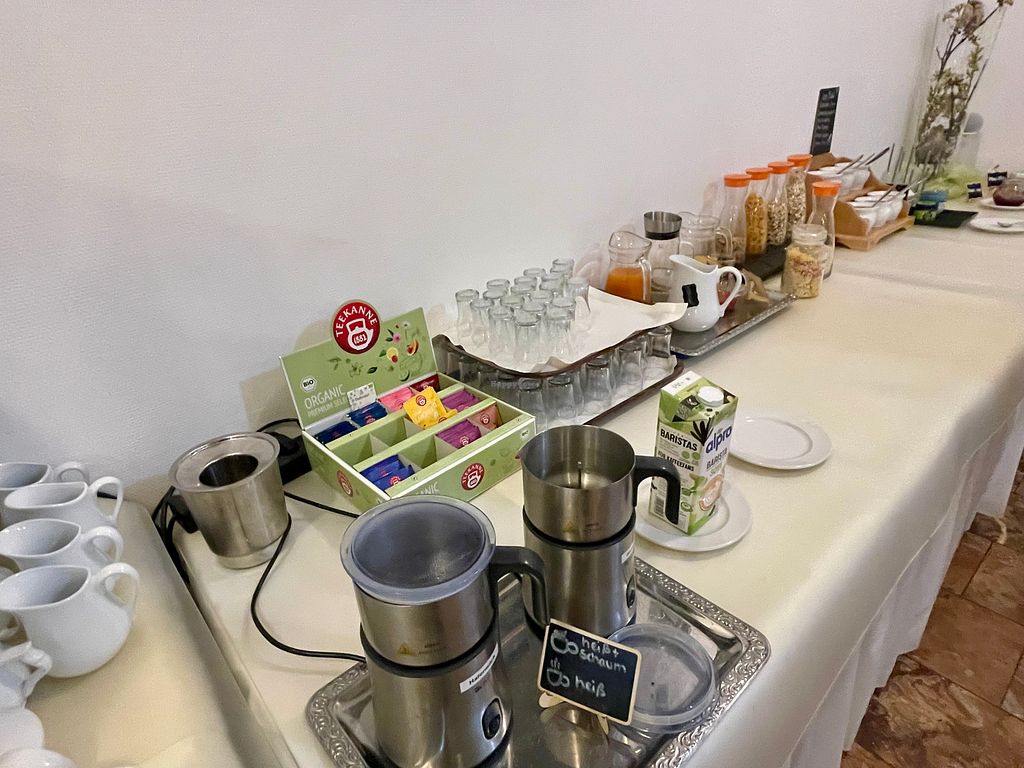 Breakfast is served in two shifts (8.00 - 9.00 / 9.30 - 10.30) and is very extensive with rolls, rye-multigrain bread, toast bread, vegan butter, coffee, plant-based milks, fruit juices, tea, fruit, vegan yoghurt, vegan cheese, vegan meat successors for the rolls, seeds and grains, cereals, jams, chocolate spread and a very extensive range of cold dishes that change from day to day.