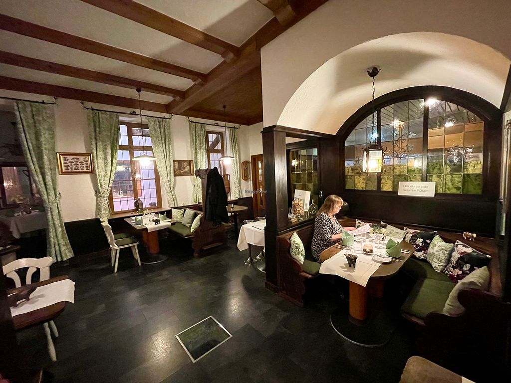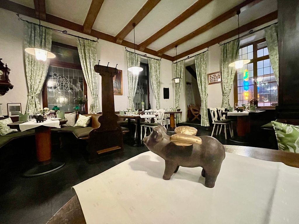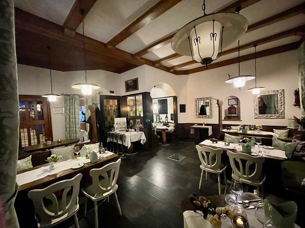 Wir waren dort für unseren Hochzeitstag in der Weinstube essen. Leider waren wir bereits zu Beginn nicht so begeistert, da man gemerkt hat, dass das Personal ungeschult war. Die Mutter vom Chefkoch war zwar sehr freundlich, aber der Service war nicht so gut wie in anderen Restaurants in denen wir bereits waren. Der Koch kam zwischenzeitlich auch rein, hat uns aber weder begrüßt, noch beachtet. Er unterhielt sich lieber mit den Gästen am Nebentisch, schließlich waren das wohl Gäste die im Hotel übernachteten. Haben wohl einen höheren Stellenwert. Der Umgang mit seiner Mutter war in unseren Augen fragwürdig, denn als ein anderer Tisch die Pilzplatte aufgetischt bekommen hat, kam der Sohn aus der Küche und meinte zur eigenen Mutter, die gerade dabei war die Leute zu bedienen, sie solle bitte mal zur Seite gehen. Er schob das Tablett mittig zum Tisch der Gäste und servierte dann selbst die Speise. Welch Selbstinszenierung. Diese Aktion wirkte auf uns leider sehr unprofessionell. Am Abend war auch einmal eine lautstarke Diskussion in der Küche zu hören. Was da los war wissen wir nicht, aber wenn Gäste zuhören können, weil die Küche offen ist, gehört sich sowas in meinem Augen nicht. Das 5 Gänge Menü war in Ordnung, aber nicht herausragend. Auf dem Tisch gab es etwas Brot mit Butter. Leider relativ unspektakulär, da es wirklich nur Butter mit etwas Pfeffer obendrauf war. Dabei gibt es soviele Möglichkeiten für einen leckeren veganen Aufstrich. Bei einem Gericht war sowohl die Soße als auch der Kartoffelbrei recht salzig. Zum Hauptgericht gab es eine Avocado, welche aber aufgewärmt wurde. Was sich der Koch dabei gedacht hat, haben wir leider nicht verstanden, denn die Avocado schmeckte dadurch bitter, sah aufgrund der braungründen Farbe nicht sehr appetitlich aus und zudem war sie ungewürzt. Echt schade, da ich Avocado absolut liebe. Optisch machten die Gerichte einen netten Eindruck, aber um ehrlich zu sein, haben wir hier schon kreativere Küche in anderen Restaurants erlebt. Das Dessert war leider das langweiligste Gericht von allen, dabei hatte ich mich darauf am meisten gefreut. Wir haben vor Ort uns nicht getraut Kritik zu äußern, weil wir uns sicher waren, dass hier keine erwünscht ist, da der Ton an dem Abend ohnehin wohl schon etwas rau war. Wir werden jedenfalls nicht mehr hier essen
