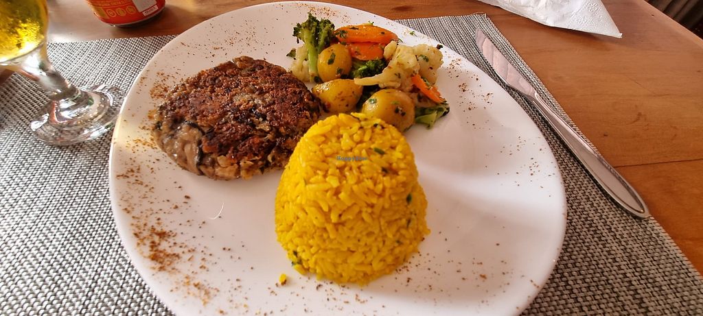 Serves meat, vegan options available. Hotel restaurant offering three vegan dishes - risotto, soy schnitzel and mushroom patty with vegetables. Please update hours if known.