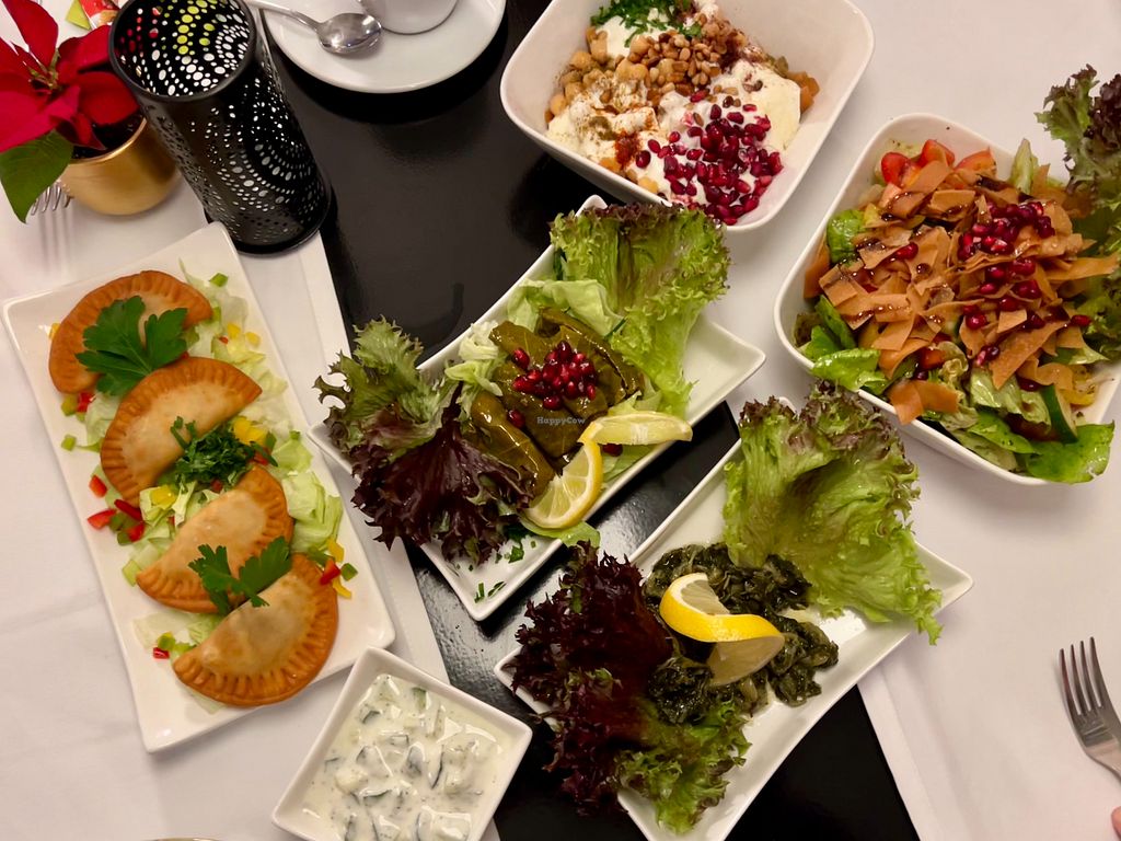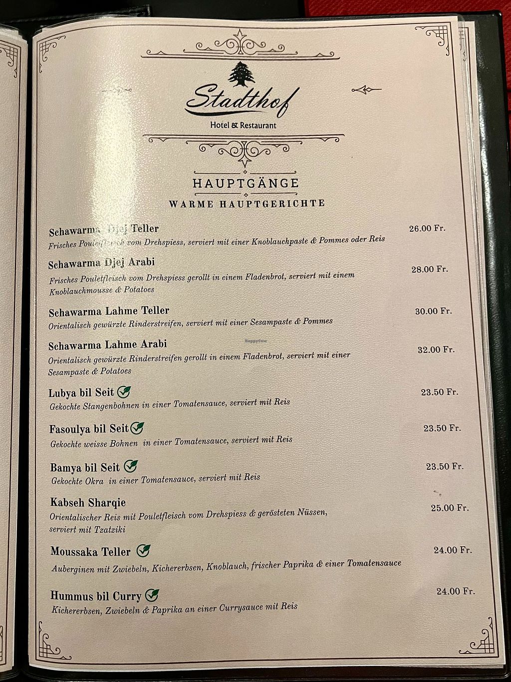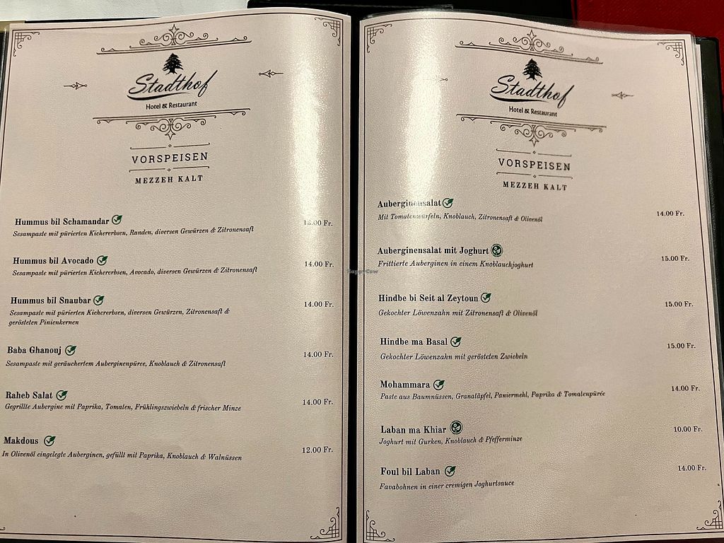Serves meat, vegan options available. Swiss-Lebanese restaurant with a large selection of clearly labelled vegan choices like Hummus, Taboulé, Baba Ghanouj, Falafel, Moussaka Teller, and a Maqali Teller with fried eggplant, cauliflower, zucchini, and falafel.